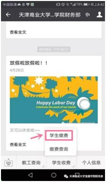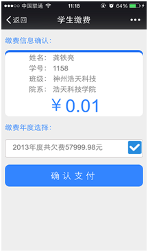 点击“学生缴费”,根据欠费情况,使用微信直接缴费:
