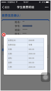 学生成功绑定账户后,点击下方的“学生收费”菜单,可以根据欠费情况进行缴费,并查询缴费明细。