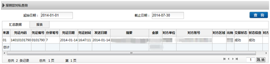 对公查询中,指定对方单位(此处对方单位名称须输入完整、正确的全称)或账号、交易状态(成功、失败)、 起止日期等条件后单击“查询”按钮即可得到查询结果。