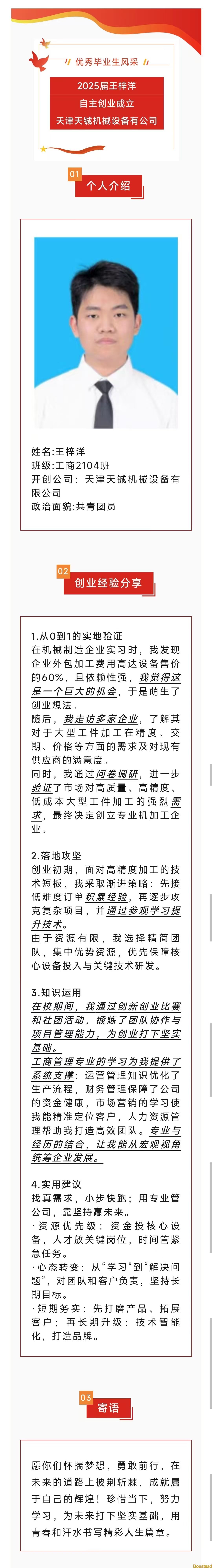 【优秀毕业生风采】2025届王梓洋自主创业成立天津天铖机械设备有限公司