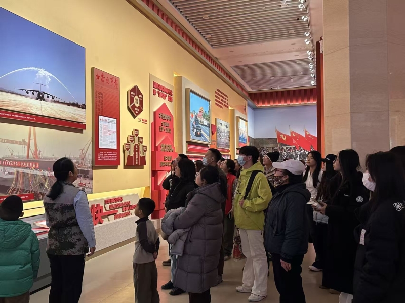在中国人民革命军事博物馆,师生们跟随讲解员重点参观了“领航强军向复兴”主题展。展览通过文物实物、武器装备模型、场景复原等多元形式,生动呈现新时代国防和军队建设的壮阔历程与辉煌成就。师生们从歼-20、山东舰等装备模型中深切感受到了强军兴军的磅礴力量,激发了爱国热情。