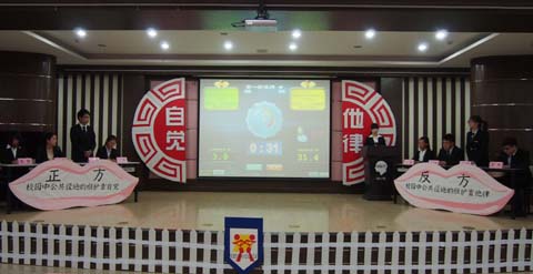 在近一个月的激烈角逐后,国际工商管理系第一代表队和国际工商管理系第二代表队成功挺进决 赛。在一段赛事回顾视频之后两支队伍以“校园中,公共设施的维护靠自觉”还是“校园中,公共设施的维护靠他律”为辩题展开了激烈的辩论。正方首先阐述了自己的观点,并举出很多实例来陈述本方观点。反方一辩随即陈述了自己的观点,条理清晰。从各自一辩立论开始,双方就展开了白热化的争夺。在随后的自由辩论环节,辩手们面对一个个犀利的问题做出准确又不失逻辑的回答,使现场高潮迭起,博得了评委和观众的阵阵掌声。经过近一个半小时的唇枪舌剑,最终国际工商管理 系第二代表队获得本次比赛冠军,国际工商管理系第一代表队获得亚军,艺术设计系代表队、计算机与信息技术代表队获得季军,国际工商管理系第三代表队、涉外 经济贸易系第一代表队、涉外经济贸易系第二代表队、外国语言文学系代表队获得优秀奖。刘春煜同学获得本次比赛的“最佳辩手”称号。