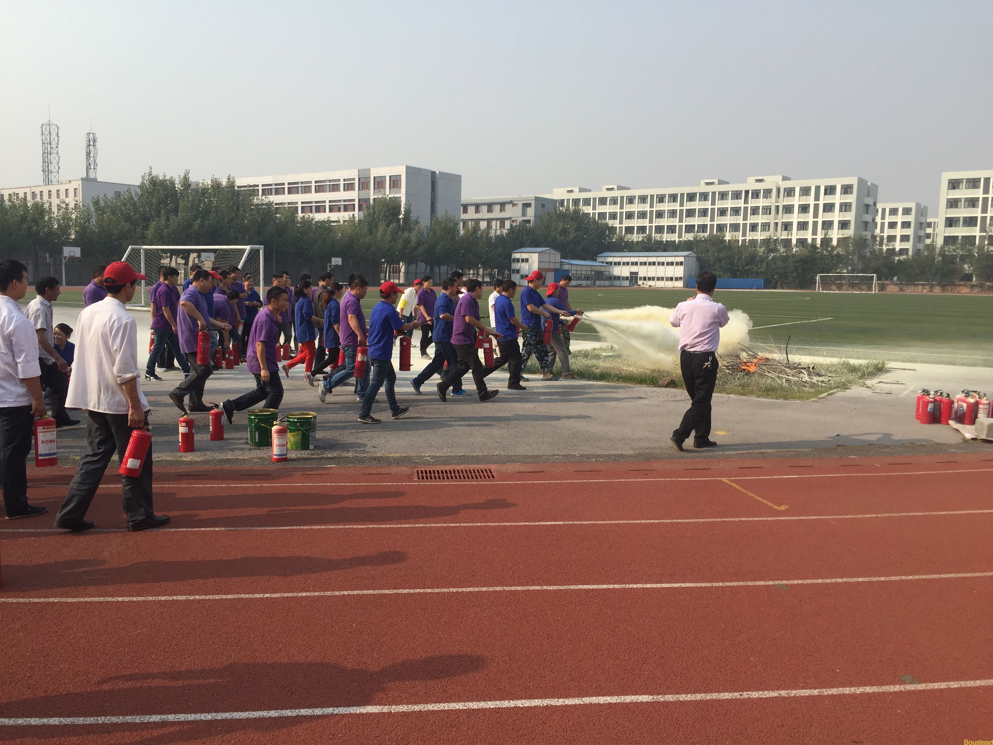为进一步强化学院食堂员工的消防安全意识,提高突发事件的应变能力,使食堂员工在火灾发生时掌握火灾现场逃生自救方法以及正确掌握灭火器使用技巧,安全保卫部、综合保障部联合于2015年10月15日14:00点,在学院大操场开展了消防演练活动。首先由安全保卫部王建国副主任对参练员工进行理论知识培训,就常用灭火器的适用范围、使用方法、操作要领和注意事项进行了详细的讲解和操作示范。随后是紧张的灭火演练,员工们在听完讲解后跃跃欲试,按照要求逐个实际操作演练,真正体验了一次火灾的扑救全过程。扑救演练结束后,王建国副主任对演练活动进行了点评,并再次强调了食堂防火工作的重要性,希望大家能够提高警惕,尽可能地预防火灾事故的发生。此次消防演练,进一步加深了食堂员工对消防安全工作的重视,也使他们初步了解、学习和掌握了一些基本的消防安全知识,提高了自防自救能力,达到了活动预期的目的。