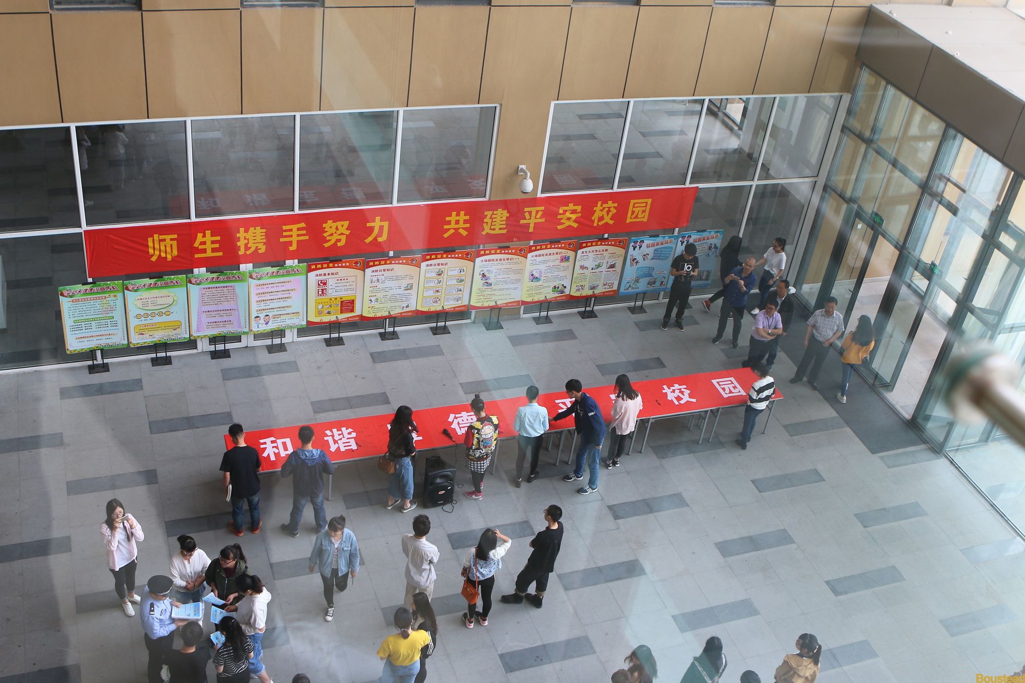 2017年5月4日中午,安全保卫部联合学生工作部在主教学楼一楼大厅举办“和谐宝德 平安校园”主题宣传活动。院长朱世和、副院长王浩、张成、院长助理李虹宾出席开幕式,安全保卫部、学生工作部相关人员、驻校民警和学生代表参加。由学生工作部李红利主任主持。
