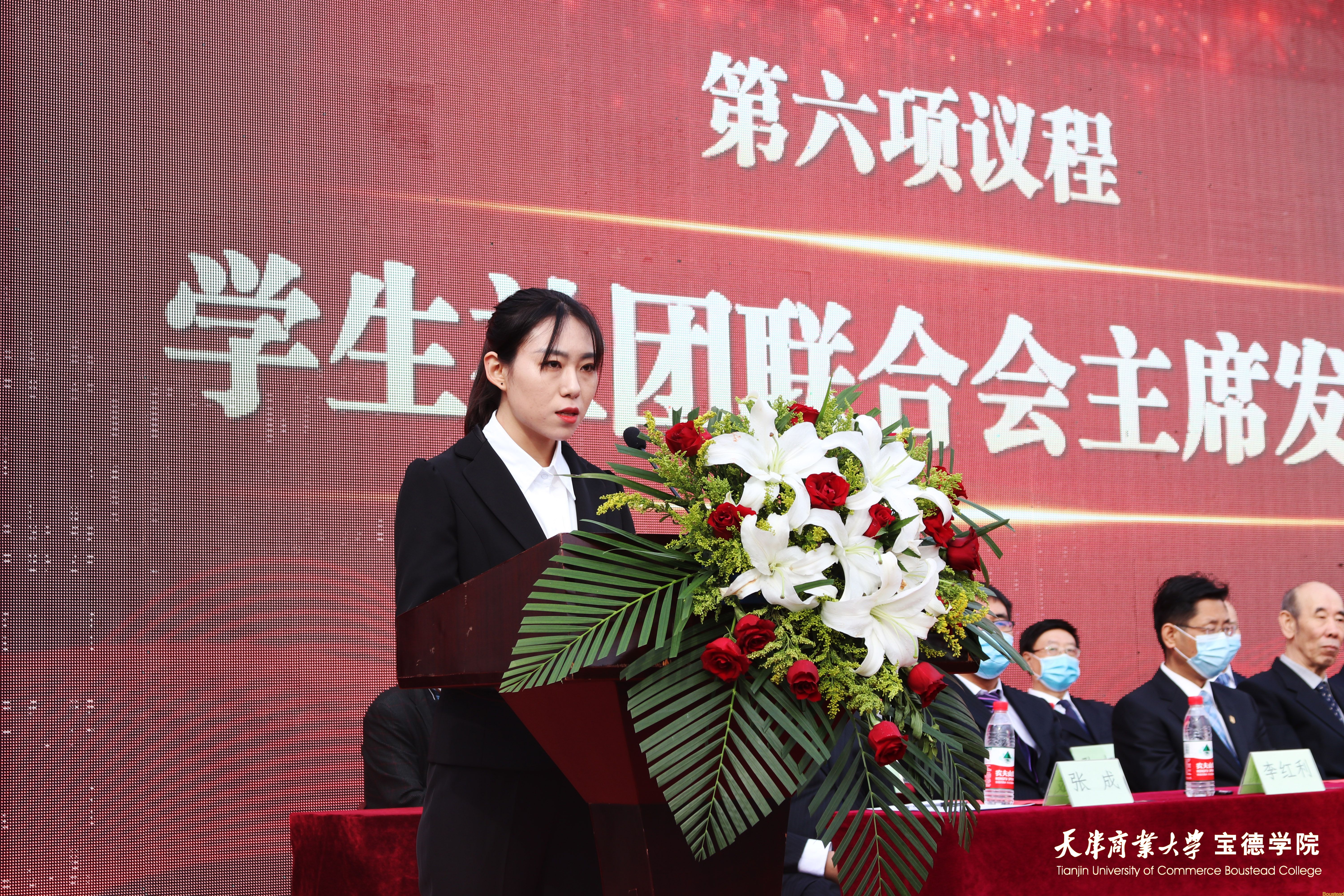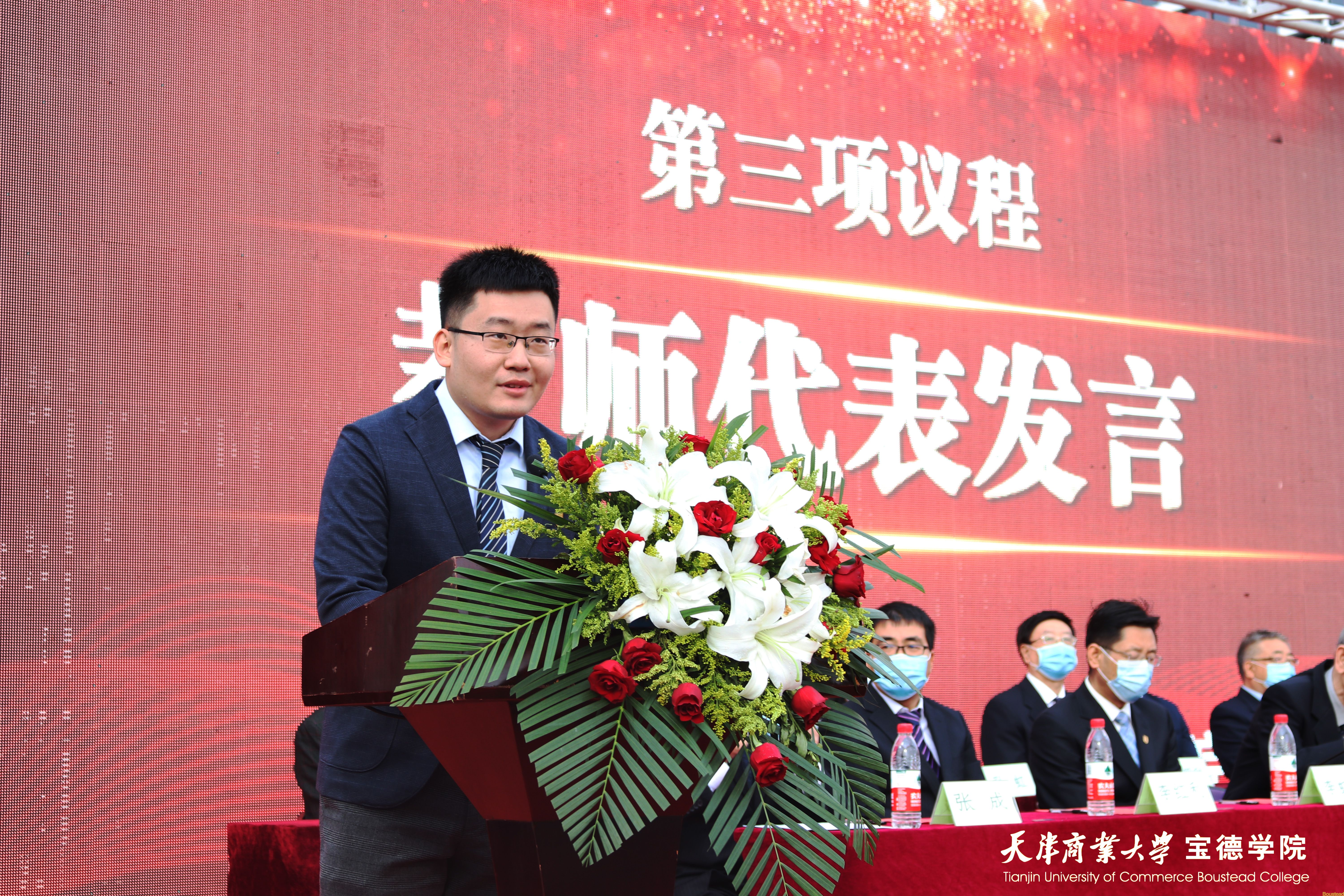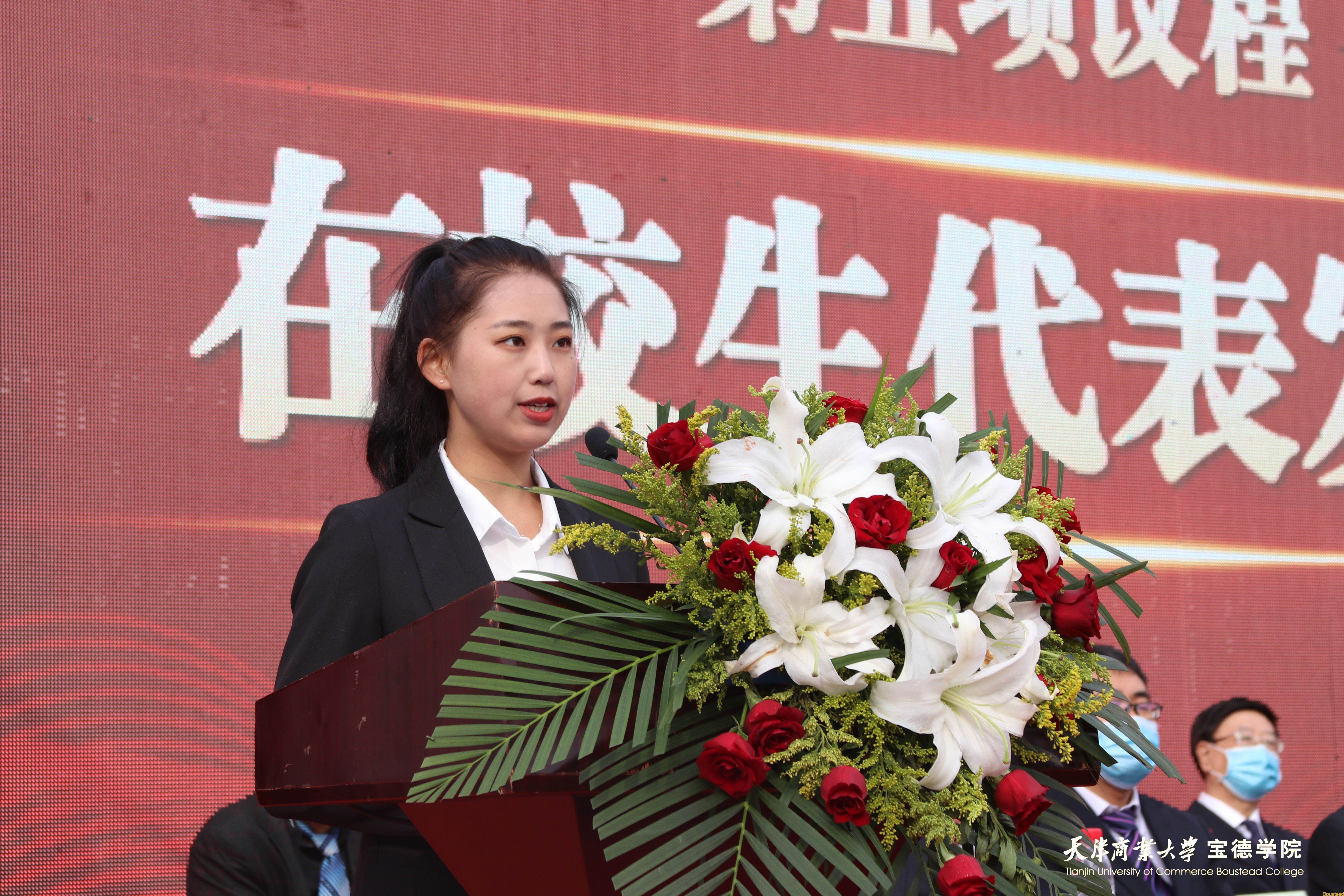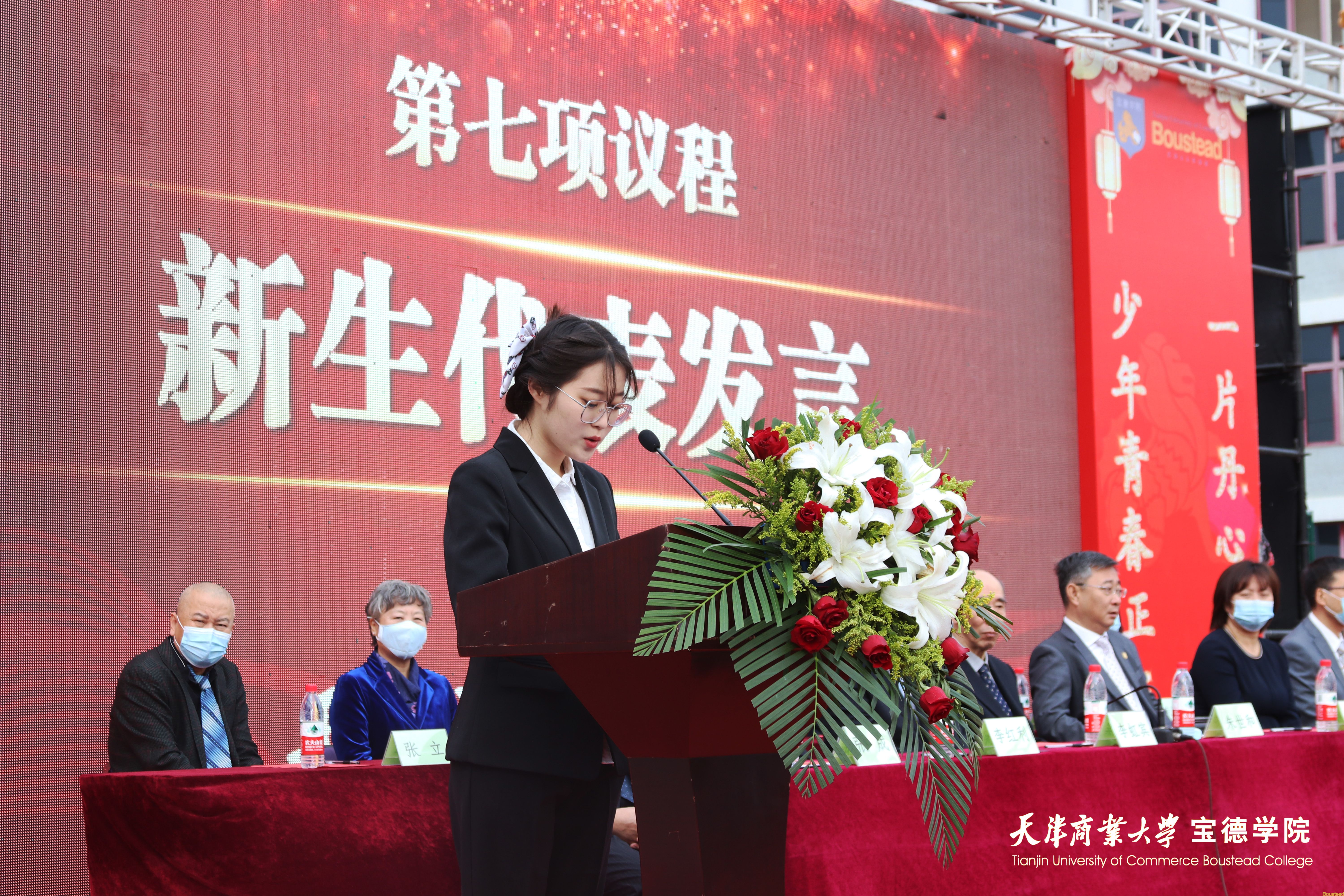 开学典礼在雄壮的国歌声中拉开了序幕。教师代表、校友代表、在校生代表、学生社团联合会负责人、新生代表先后发言。经济贸易系教师周伯温代表全体教师欢迎新同学的到来,希望同学们珍惜大学时光,不断在书本中汲取力量,努力成长成才;原涉外经济贸易系旅游管理专业0802班学生丁玉杰作为校友代表分享了自己在学习和工作中的奋斗故事,激励新同学不负青春时光勇敢追梦;在校生代表会计学系2018级的张爱嘉同学,用亲身成长经历,建议新同学注重提升自身综合素质,做全面发展的新时代大学生;学生社团联合会负责人谢菲同学向大家介绍了院学生会与社团联合会的基本情况,号召新同学在大学期间培养兴趣爱好,积极参与实践活动;新生代表经济贸易系经贸2003班的孙一卿同学,表达了对未来校园生活的憧憬和期许。