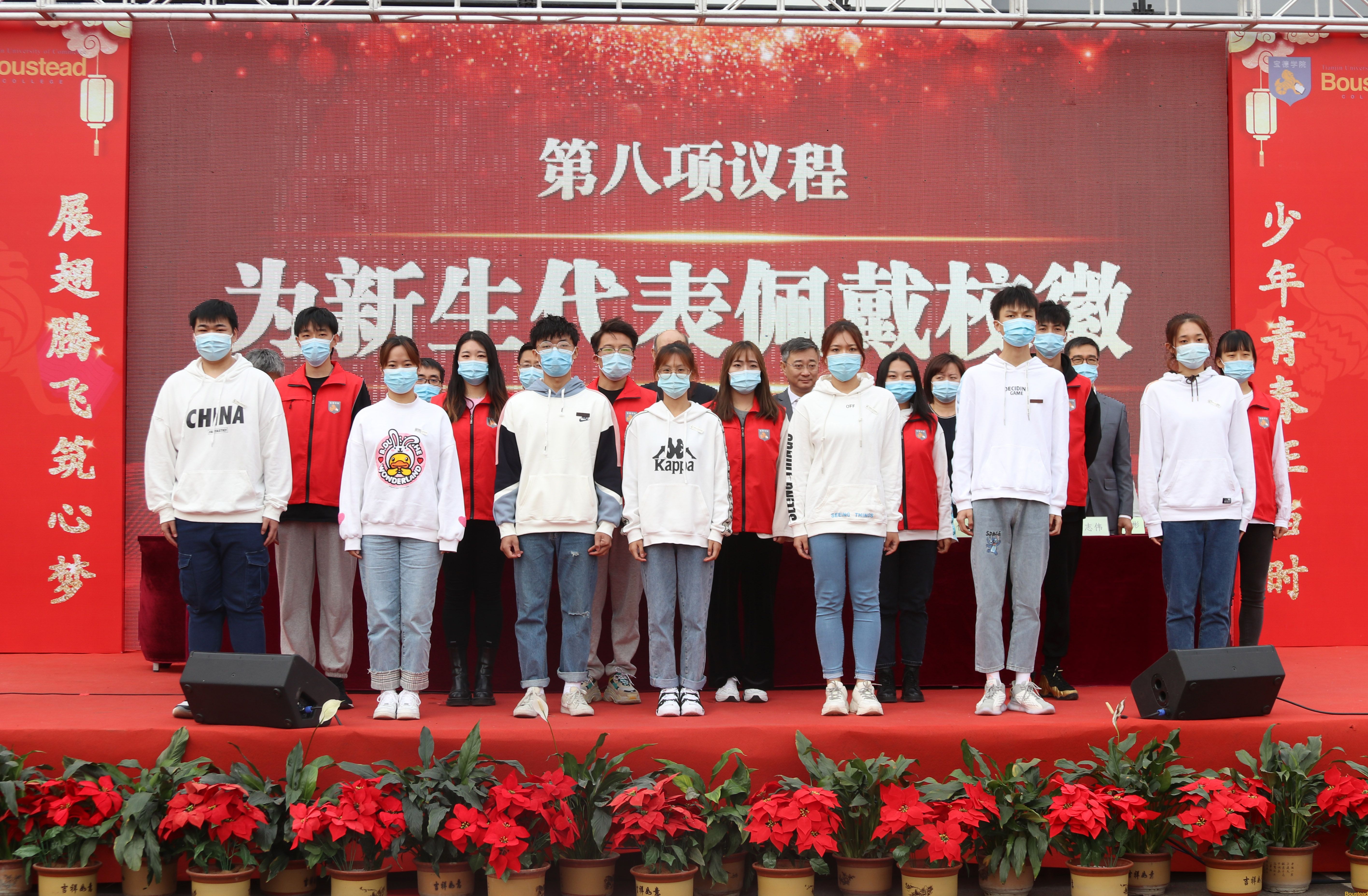 迎新志愿者走上主席台接过领导手中的校徽为新生佩戴,共同见证全体新生开启人生的崭新一页。