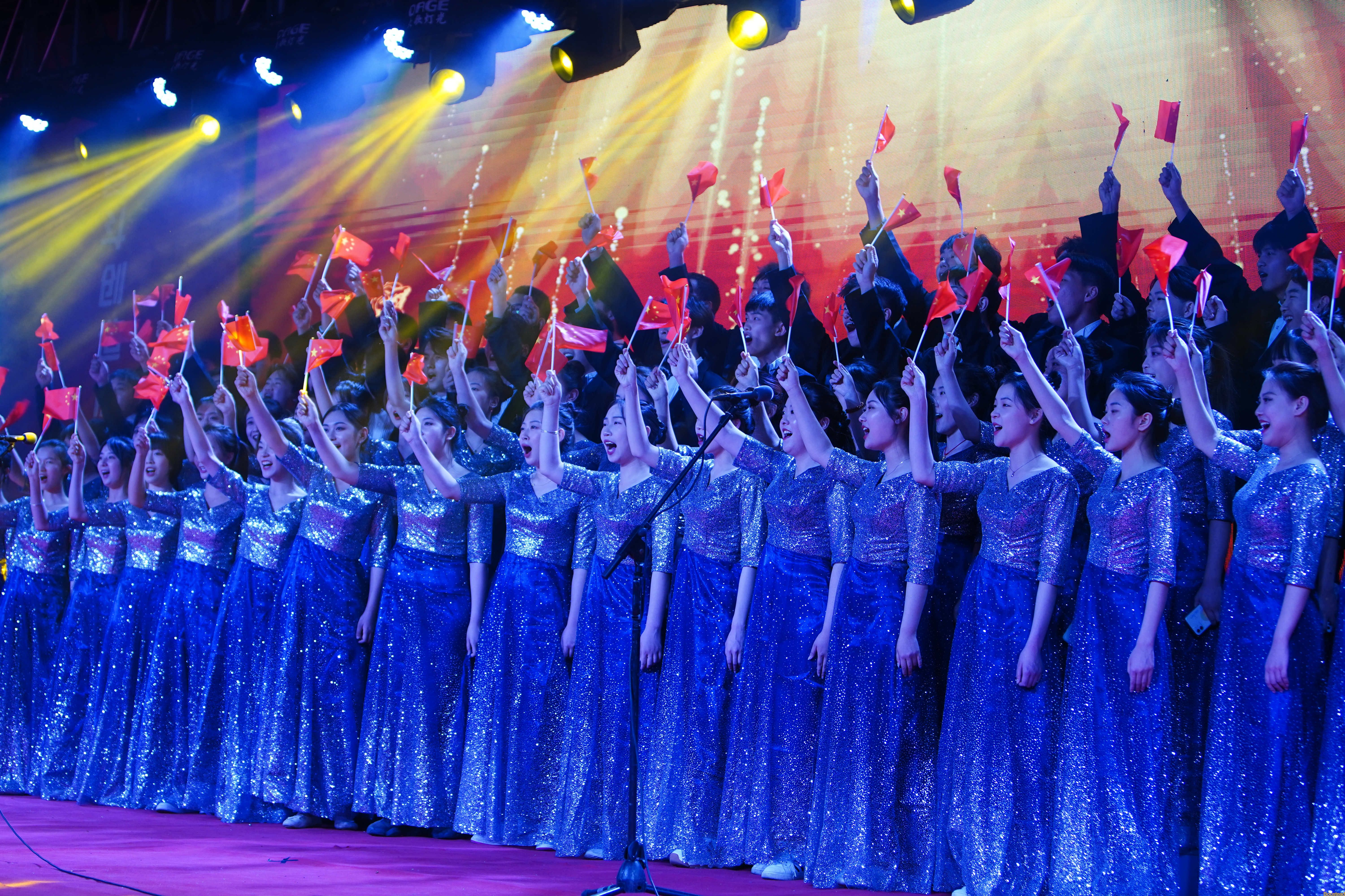 伴随着悠扬的音乐,由影视与舞蹈系承办的文艺演出拉开序幕。舞蹈《八女投江》展现了中华民族同侵略者血战到底的英雄气概;诗朗诵《青春理想》展现了自抗战时期到新时代青年坚强的理想信念;舞蹈《奔赴》展现了疫情期间党中央带领全国人民在抗疫阵线上果敢和坚守。大会最后,在场全体师生同声高唱《没有共产党就没有新中国》,将文艺晚会气氛推向高潮。