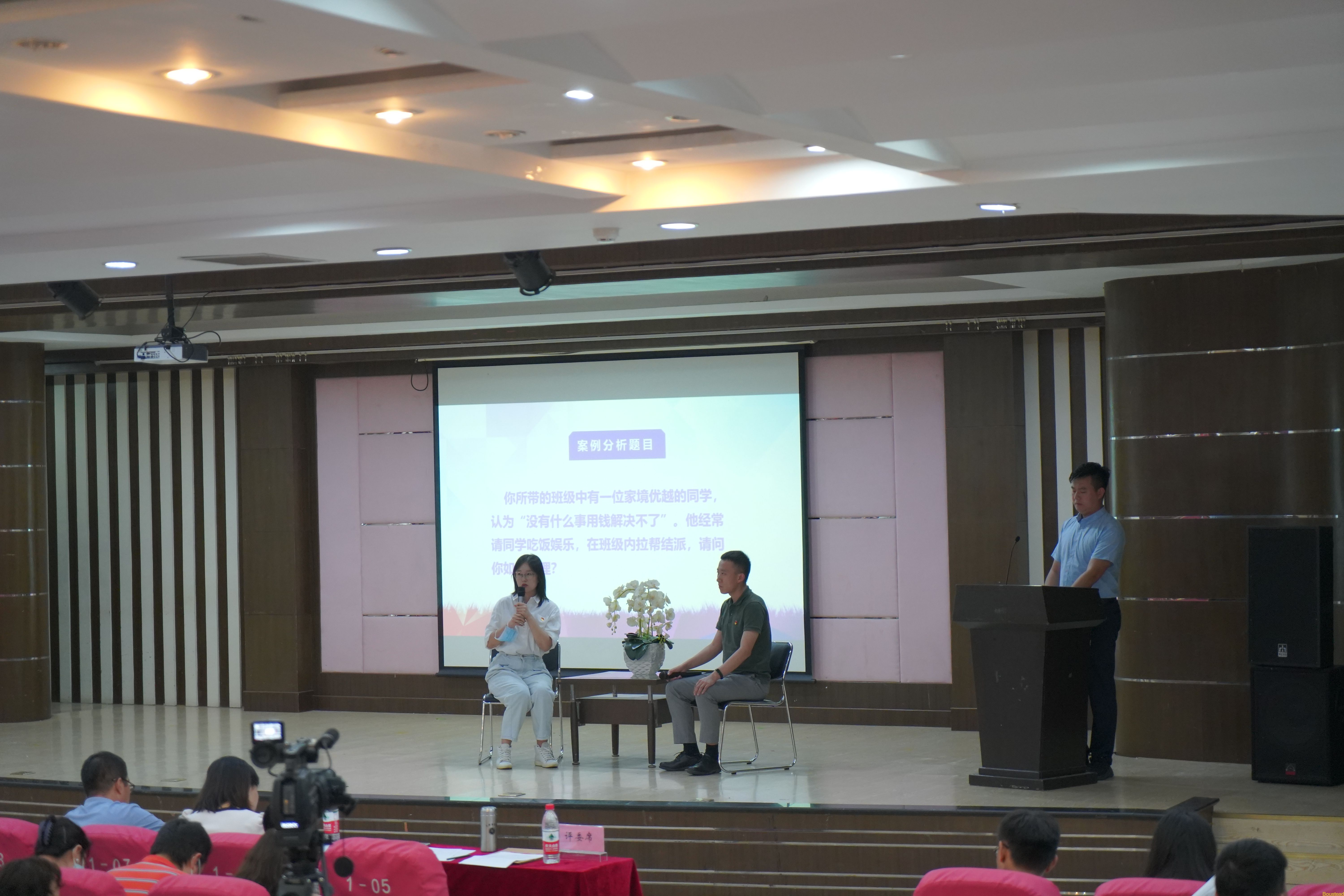 决赛于9月27日下午在B座报告厅举行。天津职业大学团委素质教育科科长、第四届天津市辅导员素质能力大赛一等奖获得者、天津市十佳辅导员赵婕同志,学院思政理论课教学部主任初明利教授、学院学生工作部主任李红利同志担任决赛评委。案例分析研讨环节重点考察辅导员分析、研判、解决问题的能力,题目紧扣学风建设、心理疏导、安全教育、经济困难帮扶、人际交往、生涯规划、评优评奖等学生实际展开,各参赛辅导员立足于工作实际,运用思想政治教育相关学科知识和方法,围绕案例中的问题本质、解决思路、实施办法及相关启示进行了详实的阐述,比赛现场,参赛辅导员们条理清晰,侃侃而谈,充分展示了理论功底和工作能力;谈心谈话环节主要考察辅导员对相关政策、学生特征、学生成长成才规律的了解把握及对学生的教育引导能力,面对学生在学习、生活、身体和心理等方面遇到的诸多问题,辅导员们动之以情、晓之以理,机智的处理和精彩的表现展现了辅导员的个人素养、知识储备和专业技能,也赢得了阵阵掌声。