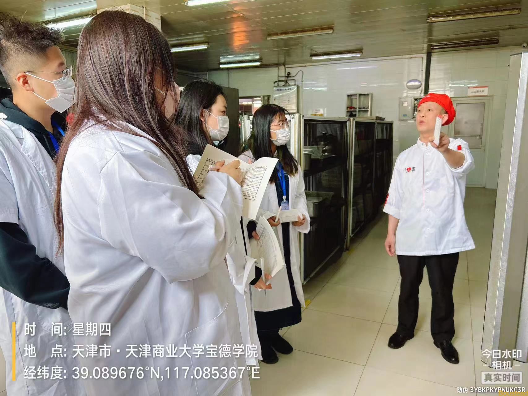 学生们按照食品卫生要求穿戴好专用衣帽进入厨房,学一食堂王经理客串导游,带领大家参观厨房各个功能区,介绍食材进货渠道、粗加工、切配、存储、餐具消洗、菜品留样等方面的工作流程以及各环节的食品卫生管理要求。在学二食堂厨房,尹经理讲解刀具案板、出餐容器的使用和消毒要求、食品添加剂管理等方面的工作,并与大家交流路边摊食品的卫生隐患和健康危害。