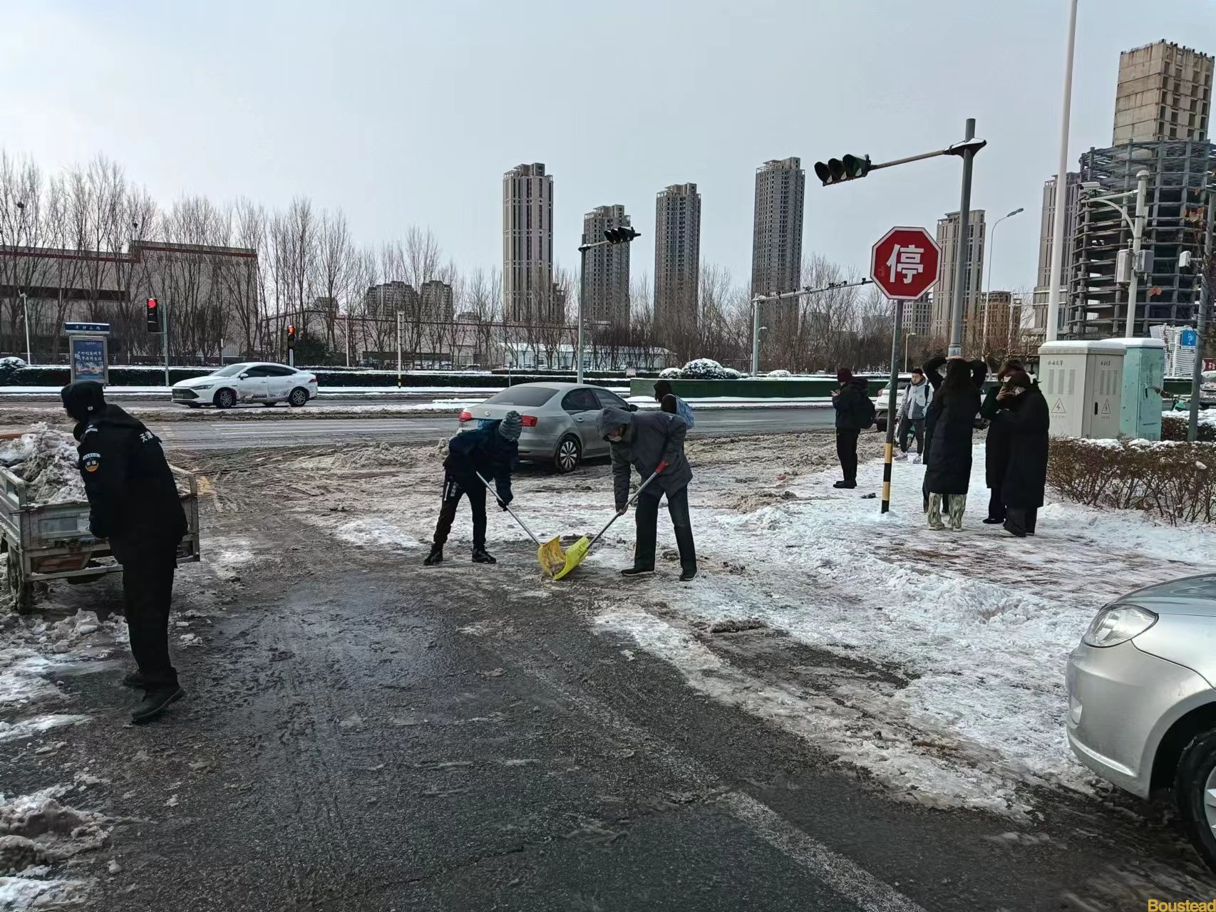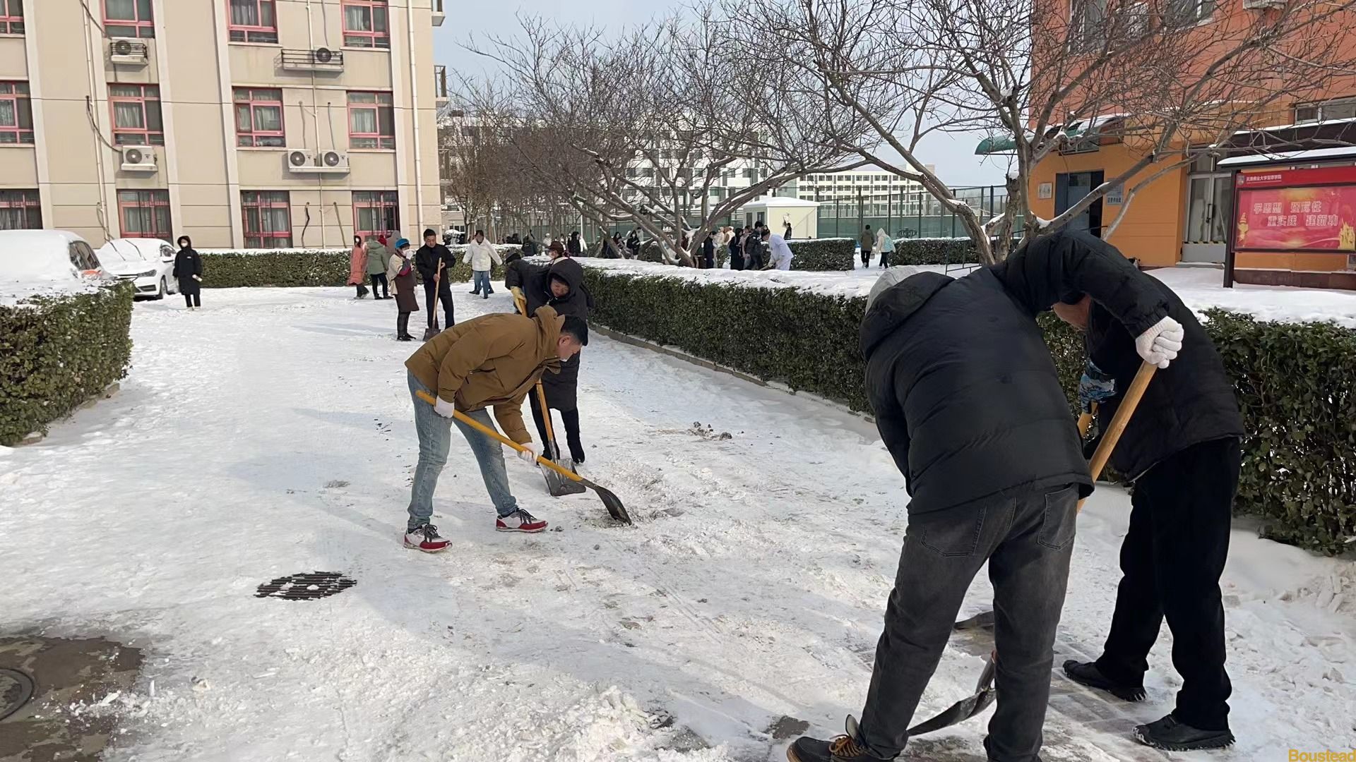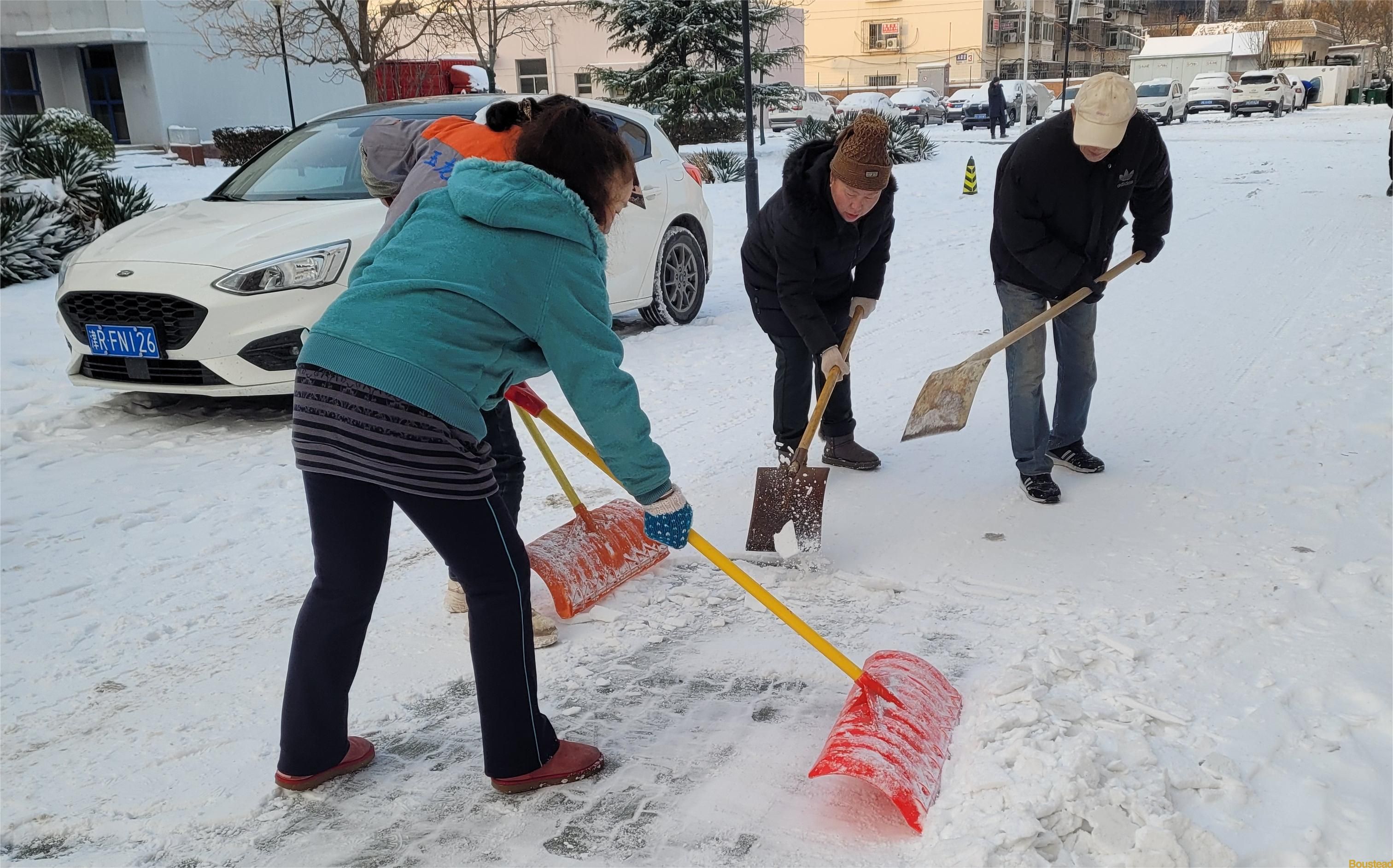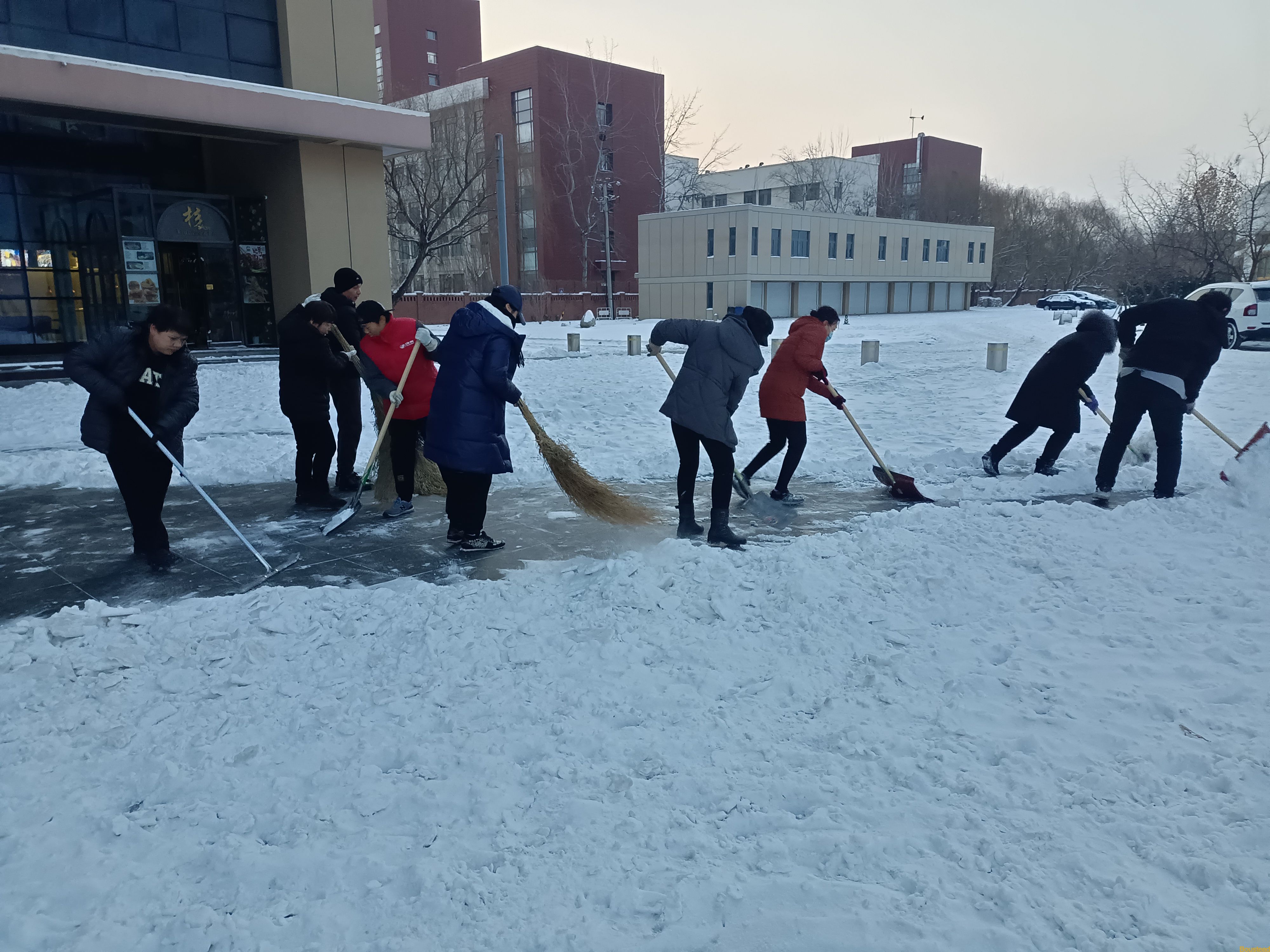 15日清晨,后勤保障部、各系部师生以及外包单位员工百余人,从学院师生出行的主要道路开始了大规模清雪破冰。学校大门口,来接送学生的家长也自发加入了清雪作业。审计专业马昀昕同学的妈妈,接过保安员手中的雪推,与王浩副院长在寒风中展开了合作和比赛。大家拿着铁锹、扫帚等清扫工具,全力挥铲着路面上的积雪,分工明确,配合默契。零下十几度的低温也没能让大家手中的工具停下来。平整度较差的面包砖路面最难清理,人困马乏,除冰进度的一度缓慢下来,但这并没有难倒大家,通过人海战术和工具的合理分配,由点到面地逐渐清理干净。后勤保障部又紧急调配来除雪大型机械设备,经过师生员工的奋战,校园主干道、各楼楼门口周边的积雪已全部清理干净,为师生员工开辟出一条条安全通道,保证了大家的出行安全。随后几天,后勤保障部又连续组织环卫、保卫等员工继续清理路旁冰雪,加大清理范围和力度。