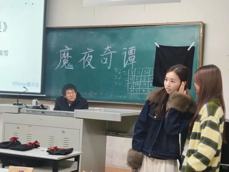 魔术社前热闹非凡,魔术师接连献技,同学们学得认真,还当场试着“露一手”。