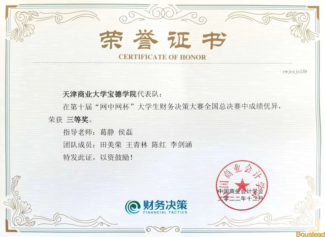 由中国高等教育学会高等财经教育分会指导,中国商业会计学会主办,南京审计大学、大连财经学院承办,厦门网中网软件有限公司、正保会计网校提供技术支持的第十届“网中网杯”大学生财务决策大赛全国总决赛于 2022年12月11日圆满结束。此次大赛从初赛到决赛,历时一个多月,全国共 372 所本科院校,经过校赛、全国初赛的层层选拔,共有 48 支参赛代表队脱颖而出参加全国总决赛。新葡的京代表队荣获华北区大赛“二等奖”,进军全国总决赛,并荣获第十届“网中网杯”财务决策大赛全国总决赛“团体三等奖”。