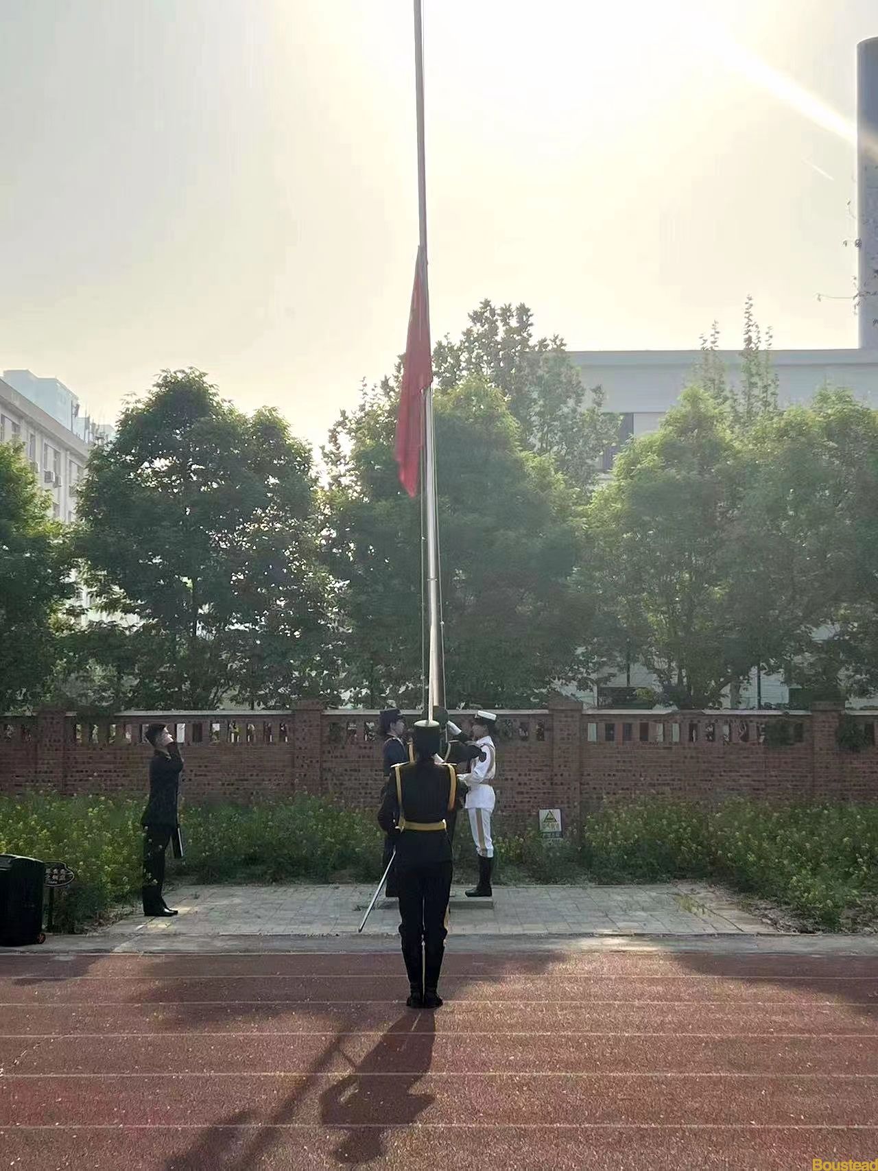 春光作序,万物和鸣。4月22日上午7:30,升旗仪式正式开始,国旗护卫队昂首阔步地将国旗护送至升旗台,随后,伴随着慷慨激昂的国歌,全体师生庄严肃立注视着五星红旗冉冉升起,在熠熠晨光下迎风飘扬。