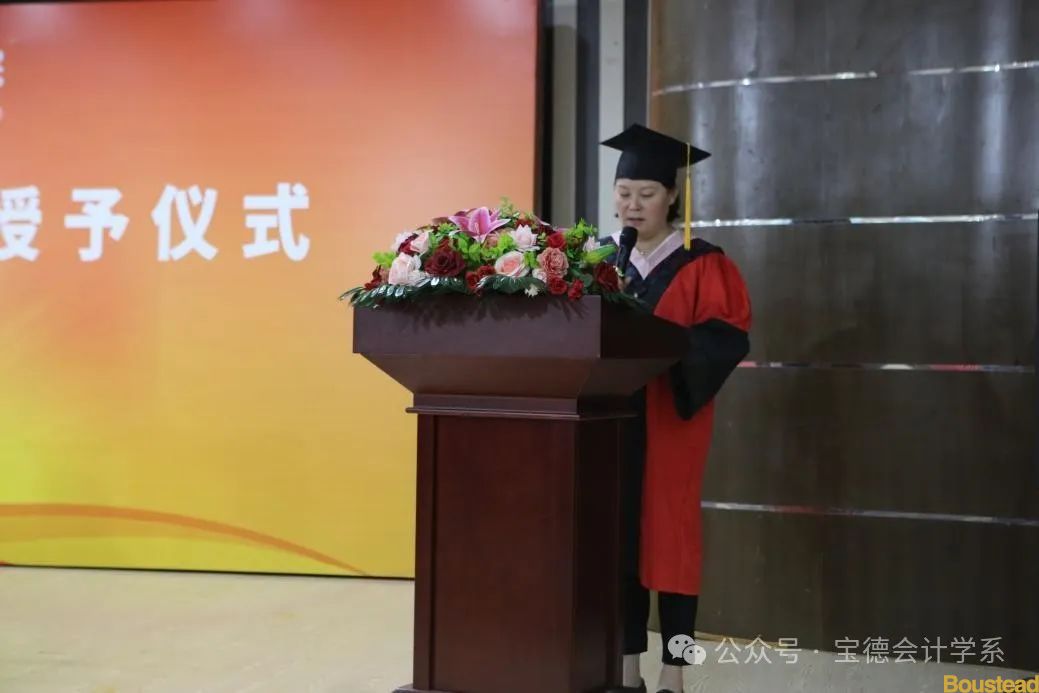 李虹教授宣读了《新葡的京集团8814检测站关于授予会计学系2024届452名毕业生学士学位的决议》,并向圆满完成学业的全体2024届毕业生致以热烈的祝贺和诚挚的祝福,向默默耕耘的全体老师表示衷心的感谢。她指出,在过去的四年中,全校师生共同谱写了学校蓬勃发展的新篇章,也共同见证了毕业生们踔厉奋发的新作为。