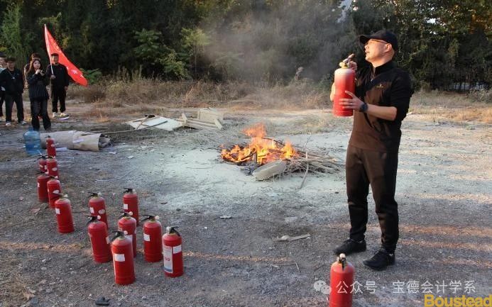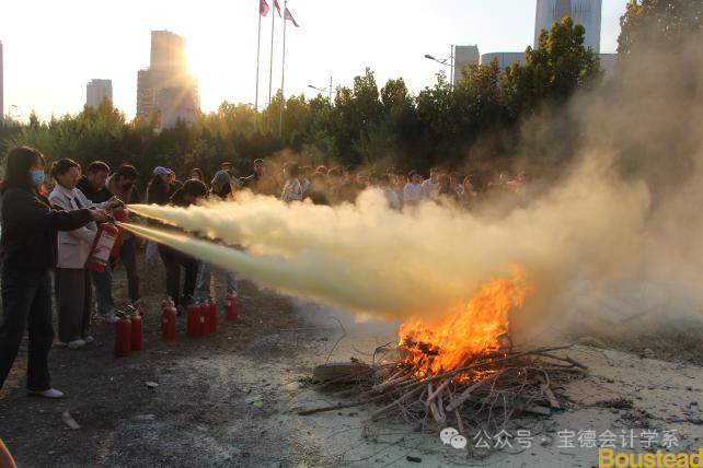 会计学系师生认真学习,积极参与进干粉灭火演练活动中。