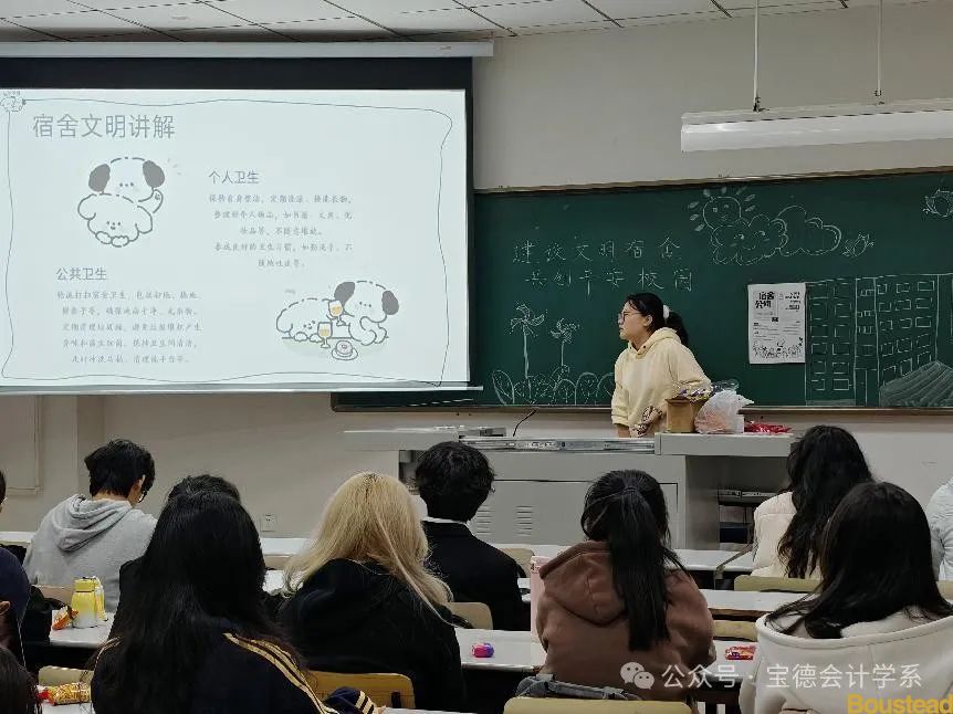 班会伊始,教室里便萦绕着温馨而又热烈的氛围。李菲同学向同学进行着关于宿舍文明的讲解。只见她站在台前,声音清脆悦耳,将宿舍文明的重要性、具体体现以及如何去践行等内容娓娓道来。那生动的话语仿佛带着魔力,让在场同学都沉浸其中,深刻认识到宿舍文明是和谐生活的基石,大家也都在心底暗暗下定决心,要为营造文明宿舍贡献自己的力量呢。