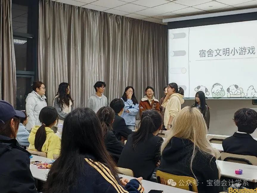 随后,进入了令人期待的宿舍小游戏大比拼环节。同学们热情高涨,纷纷踊跃参与其中。游戏围绕宿舍生活精心设计,考验舍友间的默契程度。现场气氛热烈非常,欢呼声、加油声交织一片,大家在游戏里尽情释放活力,既增进了舍友间的情谊,又让文明宿舍的氛围愈发浓厚,趣味与欢乐满溢整个班会现场。