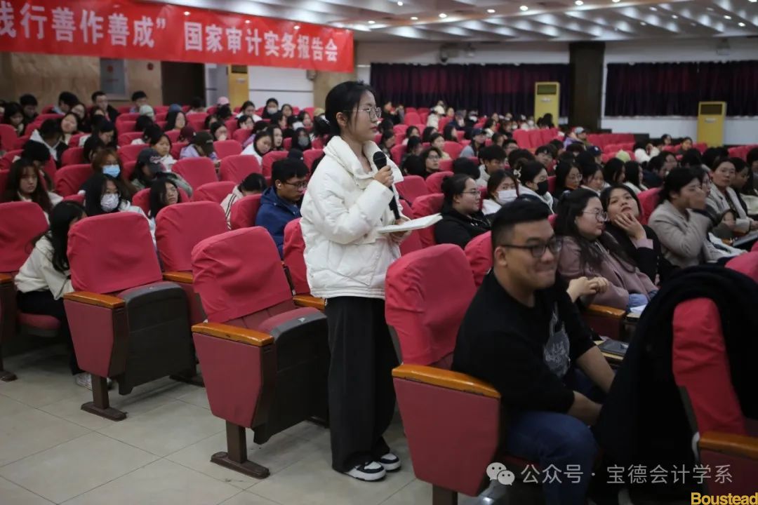 此次学术报告上,李耀华会长从国家审计的组织架构及主要类型、新时代国家审计的职责定位、国家审计的工作程序和审计案例三个方面展开讲解,深入阐述了国家审计的本质内涵、国家审计在中国式现代化进程中起到的重要作用,以及国家审计如何集结审计资源和力量,助力高质量发展的新要求。本次学术报告深入浅出,全体师生受益匪浅,报告会后,同学们进行了踊跃提问。