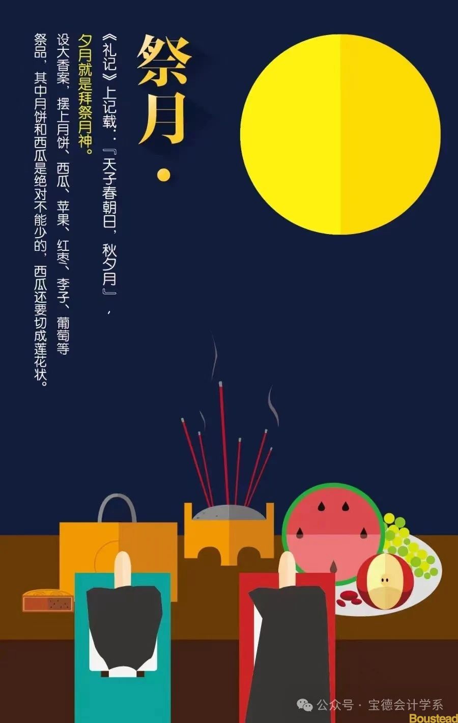 祭月,在中国是一种十分古老的习俗,实际上是古人对“月神”的一种崇拜活动。在古代有“秋暮夕月”的习俗。夕月,即拜祭月神。自古以来,在广东部分地区,人们都有在中秋晚上拜祭月神(拜月娘、拜月光)的习俗。拜月,设大香案,摆上月饼、西瓜、苹果、红枣、李子、葡萄等祭品。在月下,将“月神”牌位放在月亮的那个方向,红烛高燃,全家人依次拜祭月亮,祈求福佑。祭月赏月,托月追思,表达了人们的美好祝愿。祭月作为中秋节重要的祭礼之一,从古代延续至今,逐渐演化为民间的赏月、颂月活动,同时也成为现代人渴望团聚、寄托对生活美好愿望的主要形态。