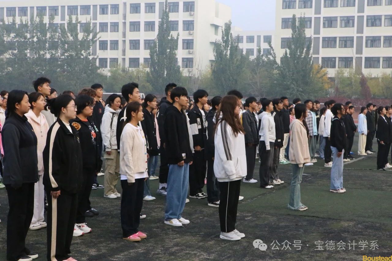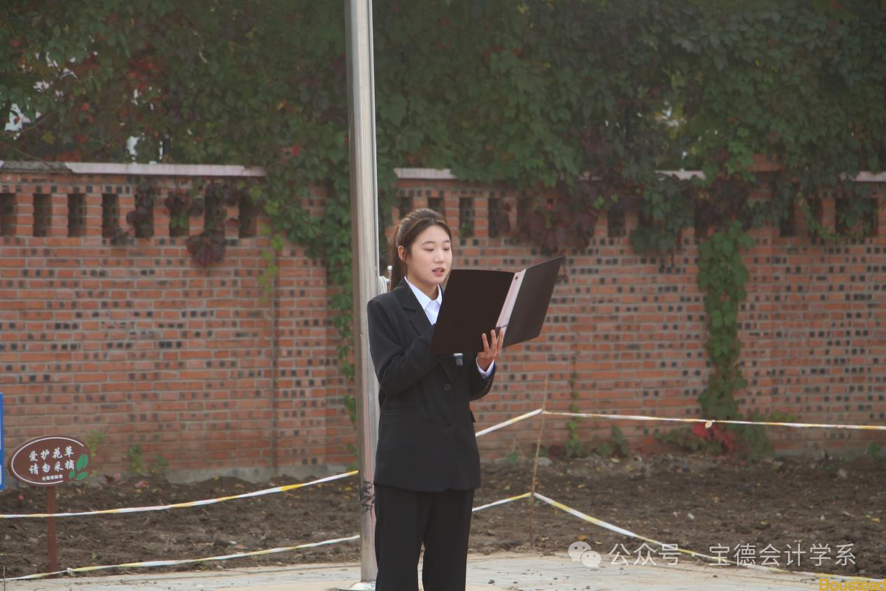 以青春之声,颂神州春华秋实;凭团结之志,扬华夏族韵风华。会计学系审计2401班辛悦怡作为学生代表在国旗下进行了演讲,她以激昂的话语向过去致敬,以坚定的决心向未来承诺。