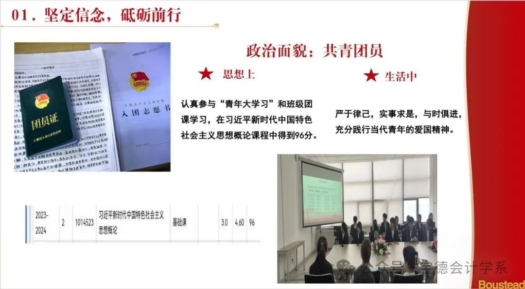 在思想上,作为一名共青团员,她热爱祖国,关心国事,坚决拥护中国共产党的领导,认真参与“青年大学习”和班级团课学习,在习近平新时代中国特色社会主义思想概论课程中得到96分。在日常生活中也严于律己,实事求是,与时俱进,充分践行当代青年的爱国精神。