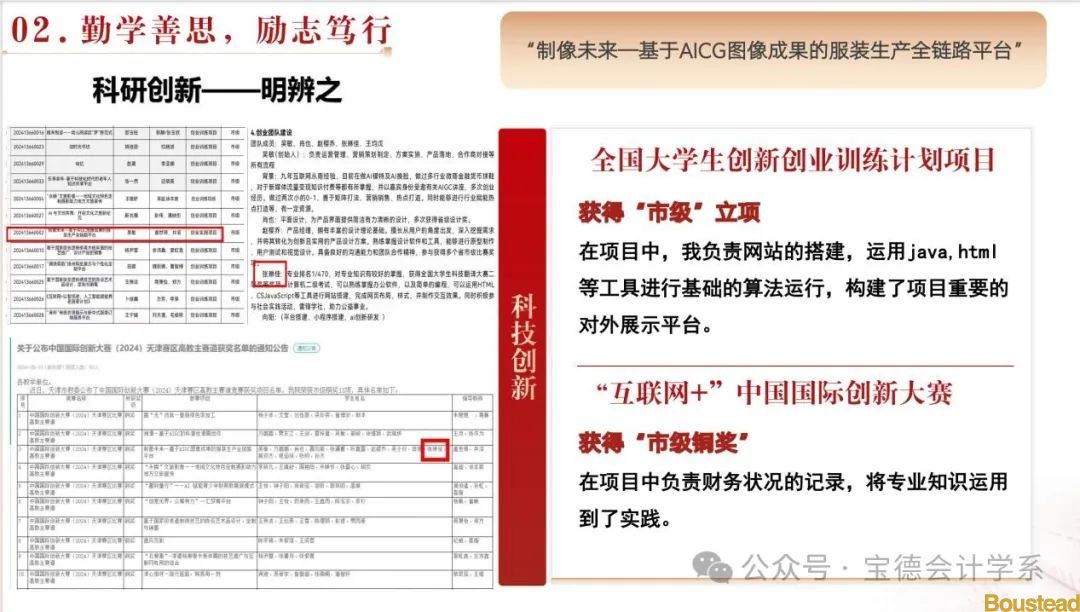 在学习上,她始终以高标准严格要求自己,刻苦钻研,追求进步。在大一学年中,学习成绩以明显优势在466人中位居第一。同时,积极参与各类竞赛,力求自我提升,共计获得17个奖项和荣誉称号。作为新时代大学生,注重创新发展,参与了全国大学生创新创业训练计划项目,所参与的“制像未来—基于AICG图像成果的服装生产全链路平台”项目获批“市级”立项,在“互联网+”中国国际创新大赛中获得“市级铜奖”。通过自学,先后获得了普通话二甲证书,计算机二级证书,初级会计证书和大学英语四级证书。