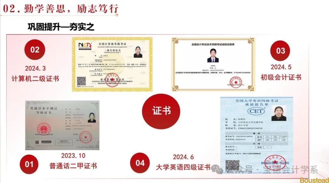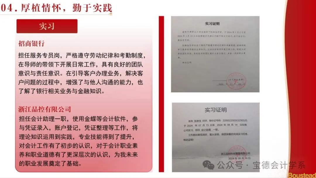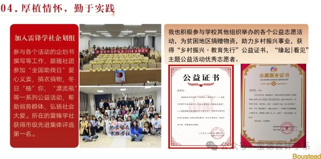 公益活动和社会实践也充实了她的大学生活。她加入了雷锋学社,参加了爱心义卖,捐衣捐物等活动,也参加学校各个社团举办的志愿者活动,获得一系列公益证书和优秀志愿者的称号。在红十字会举办的培训中,经过学习培训,获得“心肺复苏”培训证书,具备了基本的急救知识和常识,可以更好的应对突发状况。在寒暑假中,她分别到了招商银行和浙江品控有限公司进行了实习,担任服务专员和助理会计岗,了解了相关业务知识,提升了自我责任意识,具备了一定的职业素养,得到了导师的认可。