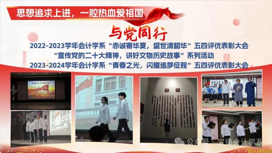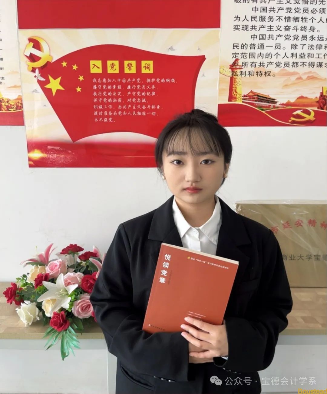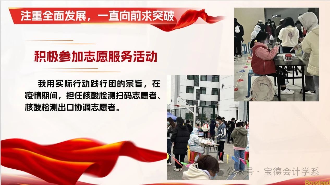 思想上,她积极进取,坚定正确的政治方向,不断提高自己的思想觉悟。大一下半年积极提交入团申请书,参加2022-2023学年会计系“赤诚寄华夏,盛世漾韶华”五四评优表彰大会、“宣传党的二十大精神,讲好文物历史故事”系列活动、2023-2024学年会计学系“青春之光,闪耀追梦征程”五四评优表彰大会,通过这些活动和团组织的培养教育,大二上半年成功通过申请,成为了一名共青团员,作为一名团员,时刻以团的章程和要求规范自己的行为,关心时事政治,积极参加团组织的各项活动,并在其中发挥积极作用。树立良好的人生观和价值观,与时俱进,积极向党组织靠拢。认真学习党的理论,牢记党的宗旨,积极参加志愿活动,协助所在团支部开展各类团日