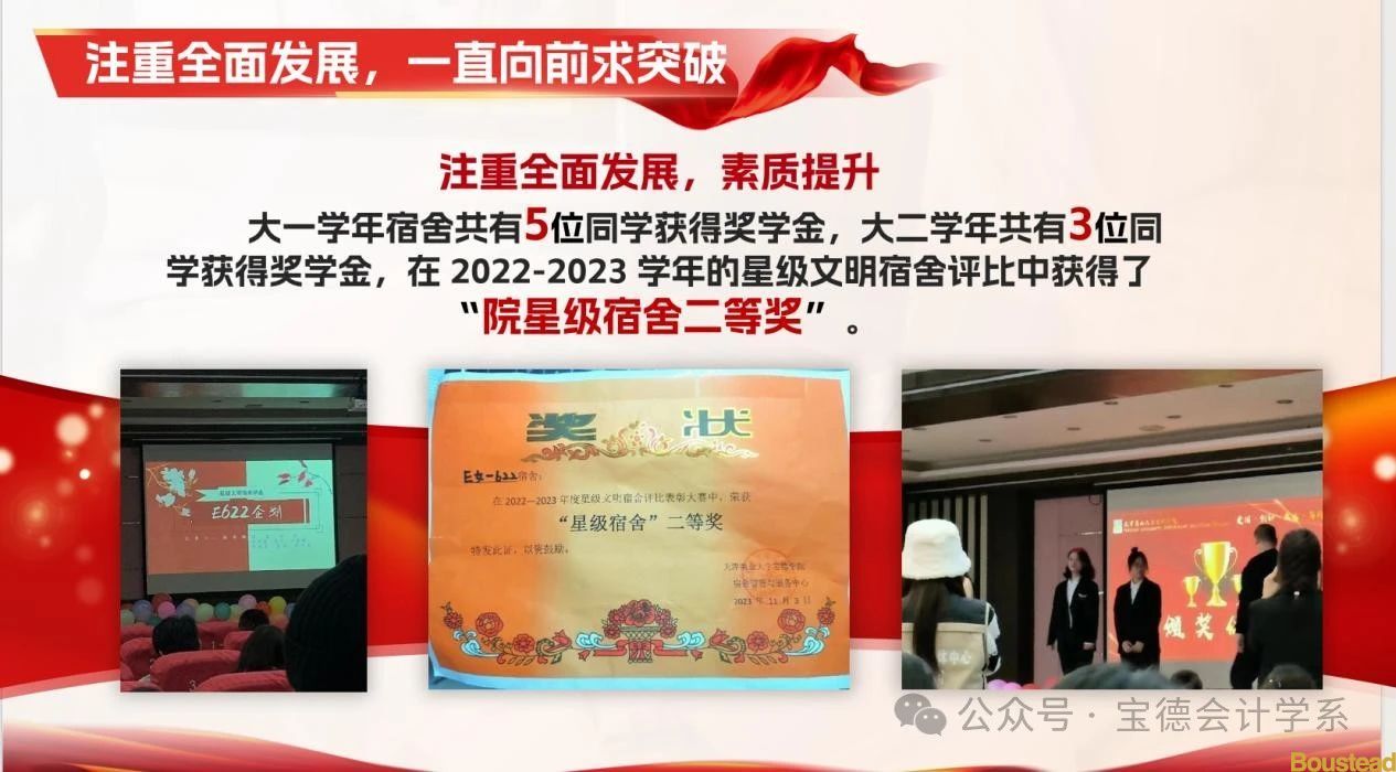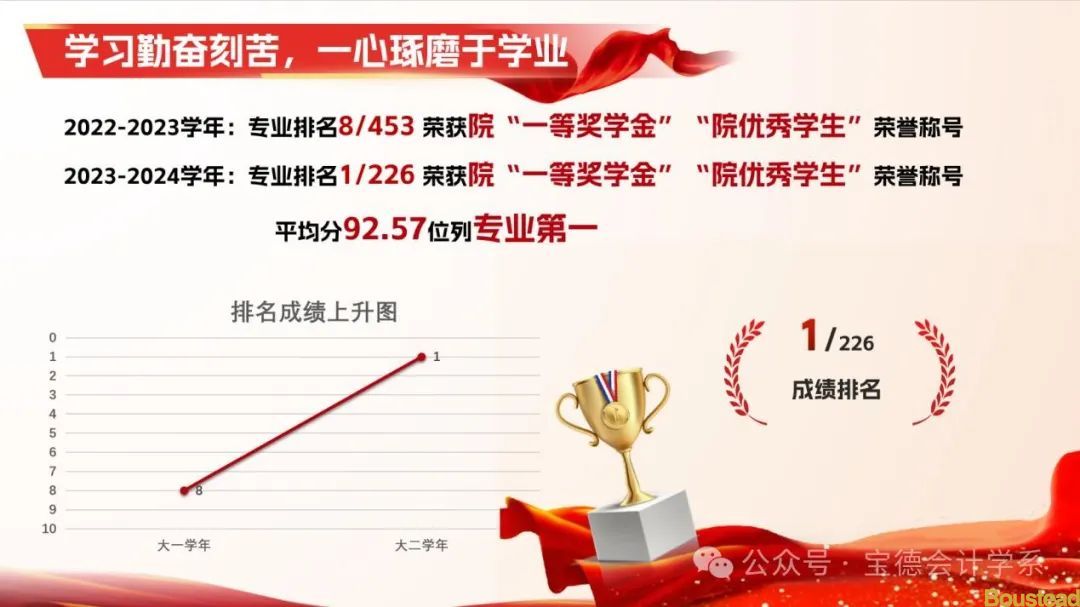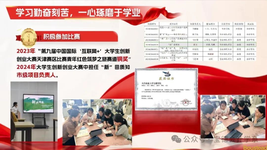 学习上,她始终牢记学习是学生的本职工作,本着“书山有路勤为径,学海无涯苦作舟”的精神,在过去两年的时间里,刻苦学习,善于思考,努力提升自己的专业技能,有较强的求知欲和进取心,取得了比较理想的成绩,2022-2023学年,荣获2022-2023学年“院一等奖学金”,“院优秀学生”称号。2023-2024学年,坚持在保持长板的基础上,有效针对补齐短板的不足,经过自己的不懈努力,位列专业第一,荣获2023-2024学年“国家奖学金”。同时,考取了初级会计师资格证、英语四级、全国普通话水平测试等证书。在基本的学习生活外,还注重其他方面的比赛,做到全面发展,积极参加各种活动,获得2023年“第九届中国国际‘互联网+’大学生创新创业大赛天津赛区比赛青年红色筑梦之旅赛道铜奖”,在2024年大学生创新创业大赛中担任“新”田质知市级项目负责人。