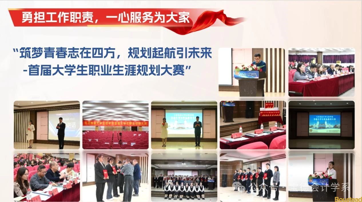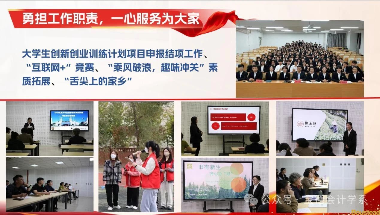 大一学年她担任会计学系学生会拓展部干事一职,组织开展大学生创新创业训练计划项目申报结项工作、“互联网+”竞赛、“乘风破浪,趣味冲关”素质拓展、“舌尖上的家乡”等活动,按时参加部门例会并且积极配合其他部门工作。大二学年她担任会计学系学生会拓展部副部长一职,成功举办“筑梦青春志在四方,规划起航引未来-首届大学生职业生涯规划大赛”。始终以“协助老师,服务同学”为宗旨,积极的与各部长沟通,获得2023-2024年院“优秀学生干部”荣誉称号。