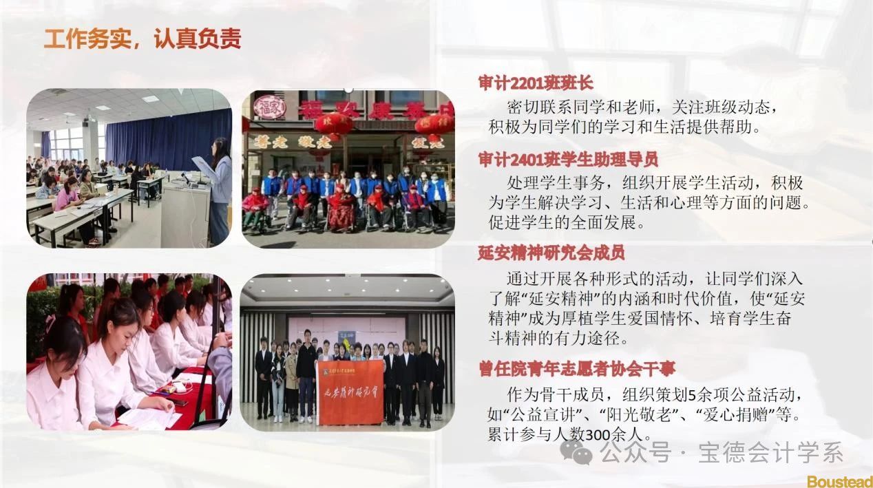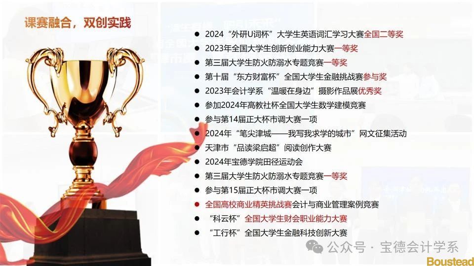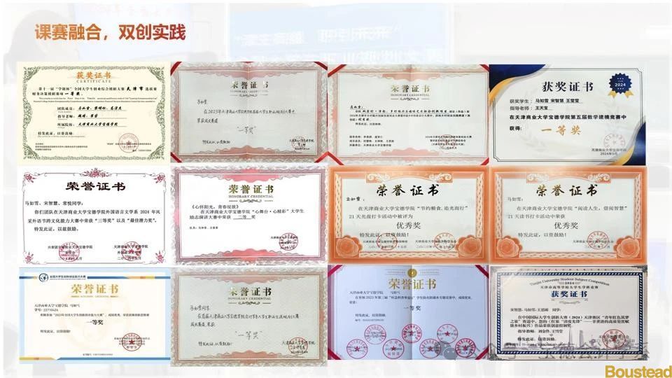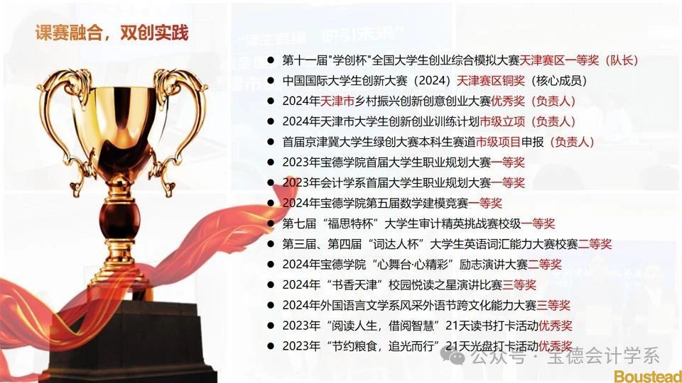 在扎根专业学习外,她坚持课赛融合,双创实践,追求全面发展,大胆尝试,挖掘更多可能。创新创业类竞赛、专业技能类竞赛、数学建模竞赛、职业规划大赛等诸多赛场上,她始终携着初心与热情,全力以赴。共计获38项荣誉,包括国家级奖项2项、市级奖项11项、校级奖项25项。会计学系曾对她进行学霸访谈报道——知不足而奋进,望远山而前行,发布至系公众号,阅读量800+。她以负责人或队长身份多次带领团队取得荣誉。2024年,所负责项目《“蔗”里——以绿色产品赋能乡村振兴》成功市级立项;项目《红旅“清废先锋”——甘蔗渣的高效处置赋能乡村振兴》获中国国际大学生创新大赛(2024)天津赛区红色筑梦之旅赛道铜奖。