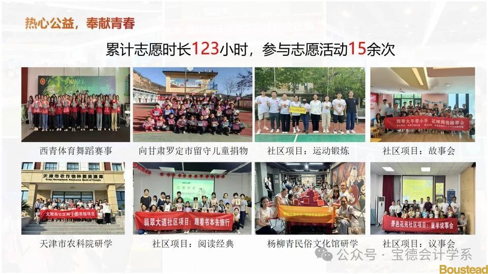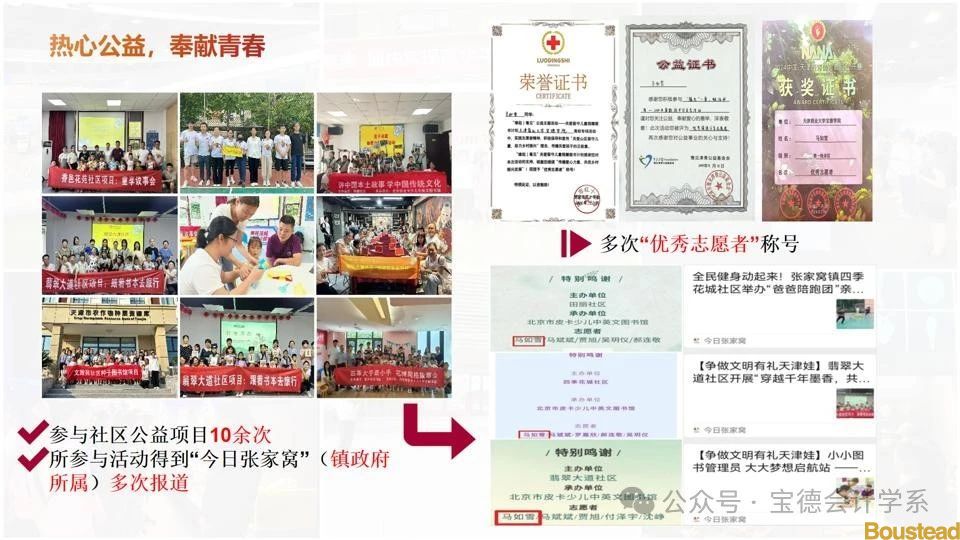 参与15余场公益活动,从帮助社区儿童学习中国传统文化到参与天津市农业科学院科普知识宣讲,再到协助举办社区文化活动、丰富居民精神生活,她始终站在服务的第一线,用实际行动诠释着“奉献、友爱、互助、进步”的志愿精神。多次荣获市级“优秀志愿者”称号,多次得到“今日张家窝”公众号(张家窝镇政府所属)的报道和认可。