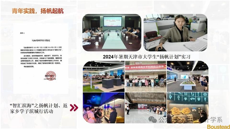 同时,她参加了2024年暑期天津市大学生“扬帆计划”实习,成为滨海高新技术产业开发区党委实习生,进行政务实习,展现出良好的精神风貌和工作状态,顺利完成了各项实习任务,得到了领导和同事们的一致肯定。