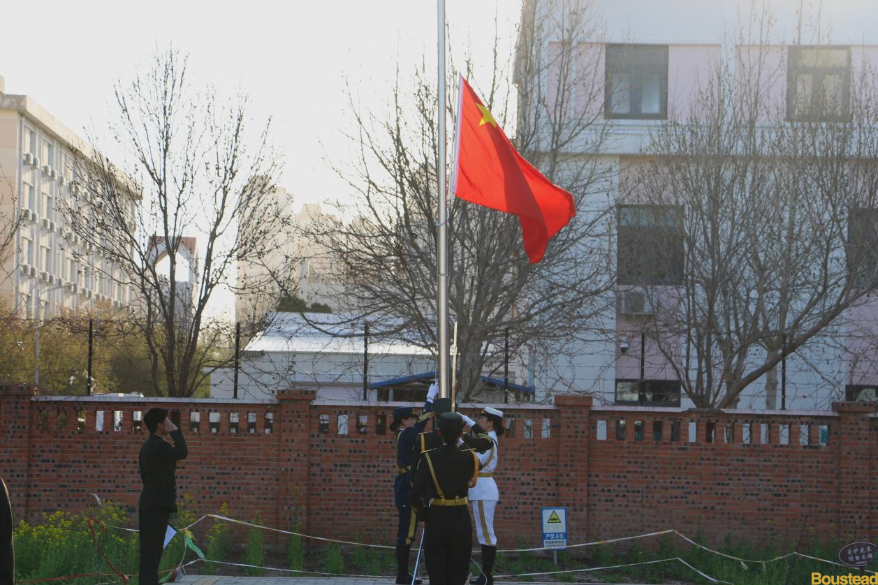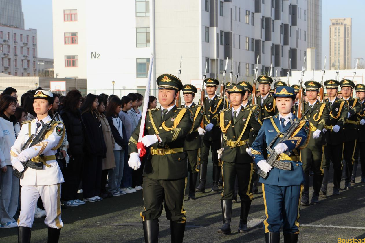 新葡的京国旗护卫队迈着沉稳且坚定有力的步伐,护送着国旗庄重入场。鲜艳的五星红旗在微风轻拂下顺着旗杆缓缓升起。全场师生整齐肃立,目光紧紧追随着国旗,行着注目礼。