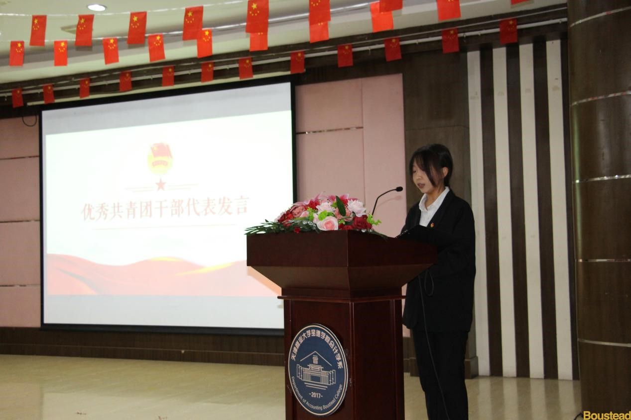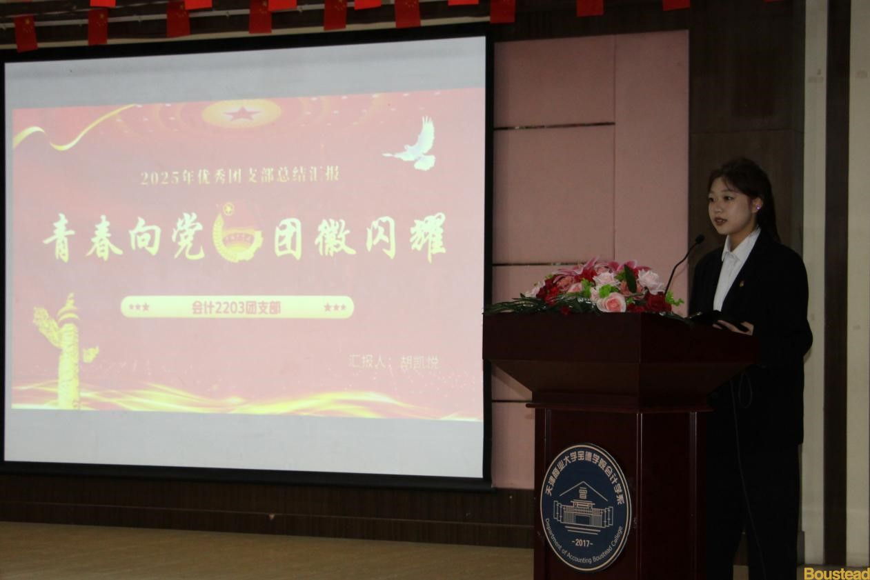 优秀共青团员代表会计2304团支部陈偲颖同学、审计2302团支部解文昊同学发言,结合学习实践、志愿服务、学科竞赛等经历,分享成长感悟与奋斗故事,展现新时代团员的担当。优秀共青团干部代表会计2305团支部李新玉同学、会计2202团支部詹梓健同学,发言字字铿锵彰显青年担当,从躬身实践的感悟到未来征程的展望,发言中流淌的不仅是团干部的赤诚初心,更点燃了全体青年在追梦路上勇毅前行。优秀团支部代表会计2203团支部和会计2301团支部,也进行了精彩的展示交流和集体表演,呈现支部在思想建设、活动创新等方面的成果,分享管理经验,为团支部建设提供范例,赢得现场热烈反响。