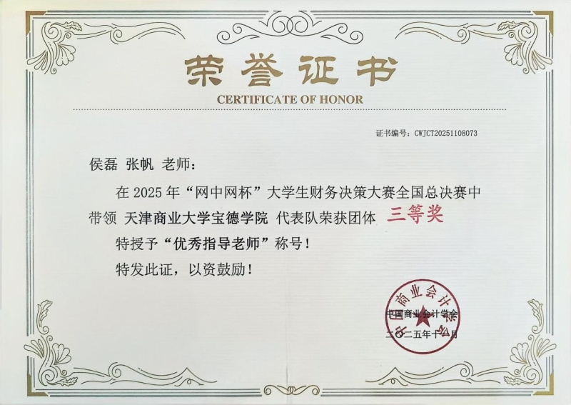 当前,企业数字化转型已成为必然趋势,而数字化经营管理与决策能力的培养,也成为高校教育教学的重要课题。2025年11月8日,由中国商业会计学会主办,大连财经学院承办,厦门网中网软件有限公司、厦门网中网教育科技有限公司、北京东大正保科技有限公司、正保会计网校支持的第十三届“网中网杯”大学生财务决策大赛全国总决赛于辽宁大连圆满收官。作为全国普通高校学科竞赛排行榜赛项,本届“网中网杯” 大学生财务决策大赛,受到院校的广泛关注和积极响应。自8月启动以来,历经校级选拔、区域突围,最终从全国600余支队伍中脱颖而出54支代表队入围总决赛。经过激烈角逐,新葡的京集团8814检测站荣获“团体三等奖”,会计学系会计教研室主任侯磊老师、财务管理教研室张帆老师荣获“优秀指导老师”荣誉称号。