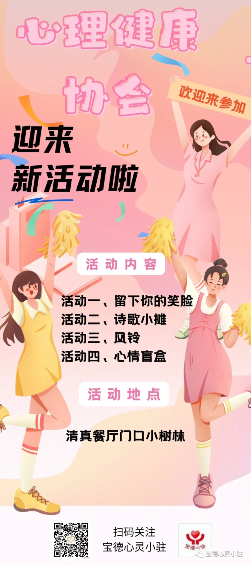 为了加强人文关怀和心理疏导,营造积极健康的校园心理文化氛围,培养师生健康生活理念,丰富校园生活,宣传普及心理健康知识,大学生心理健康协会开展了一系列丰富多彩的活动,诚邀大家来参加。