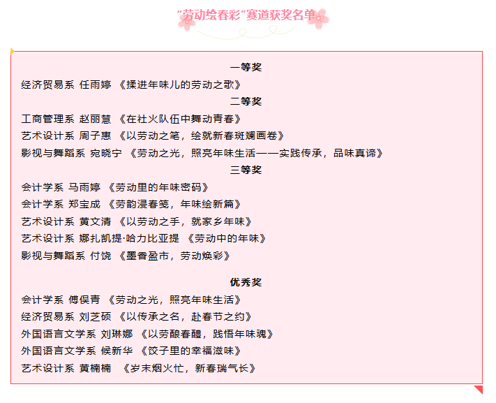 随着新春佳节的喜庆余韵仍在校园中回荡,备受瞩目的 “迎新春,劳动绘春彩,感受身边美” 征文活动也落下帷幕。自活动开展以来,同学们积极响应,踊跃参与,共收到来自各个系别的大量优秀作品。同学们以饱含深情的笔触,生动展现了劳动的魅力与生活中的美好瞬间,为我们带来了一场充满年味与温情的文化盛宴。
