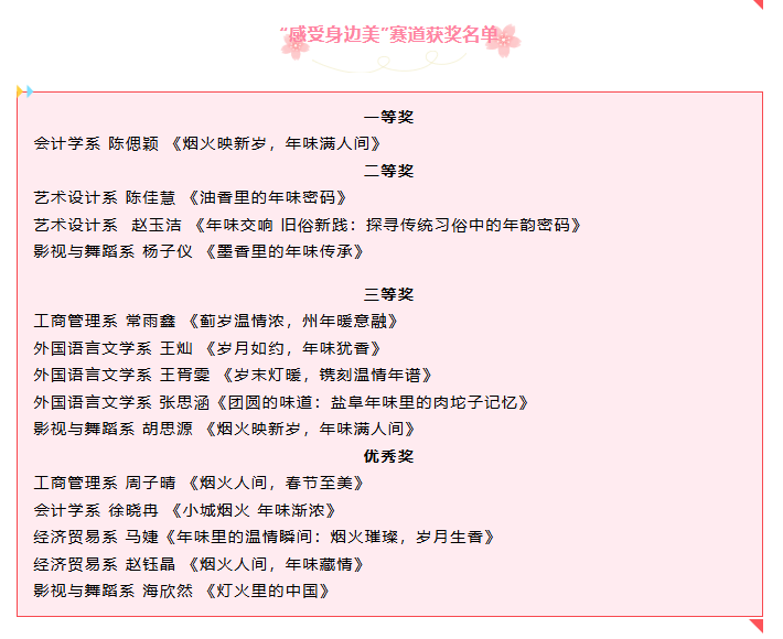 在此,我们向所有获奖同学表示祝贺!同时,也向参与本次活动的全体同学表示衷心的感谢。你们的积极参与让这个春节变得更加意义非凡,每一篇作品都凝聚着对生活的热爱与对美的追求。