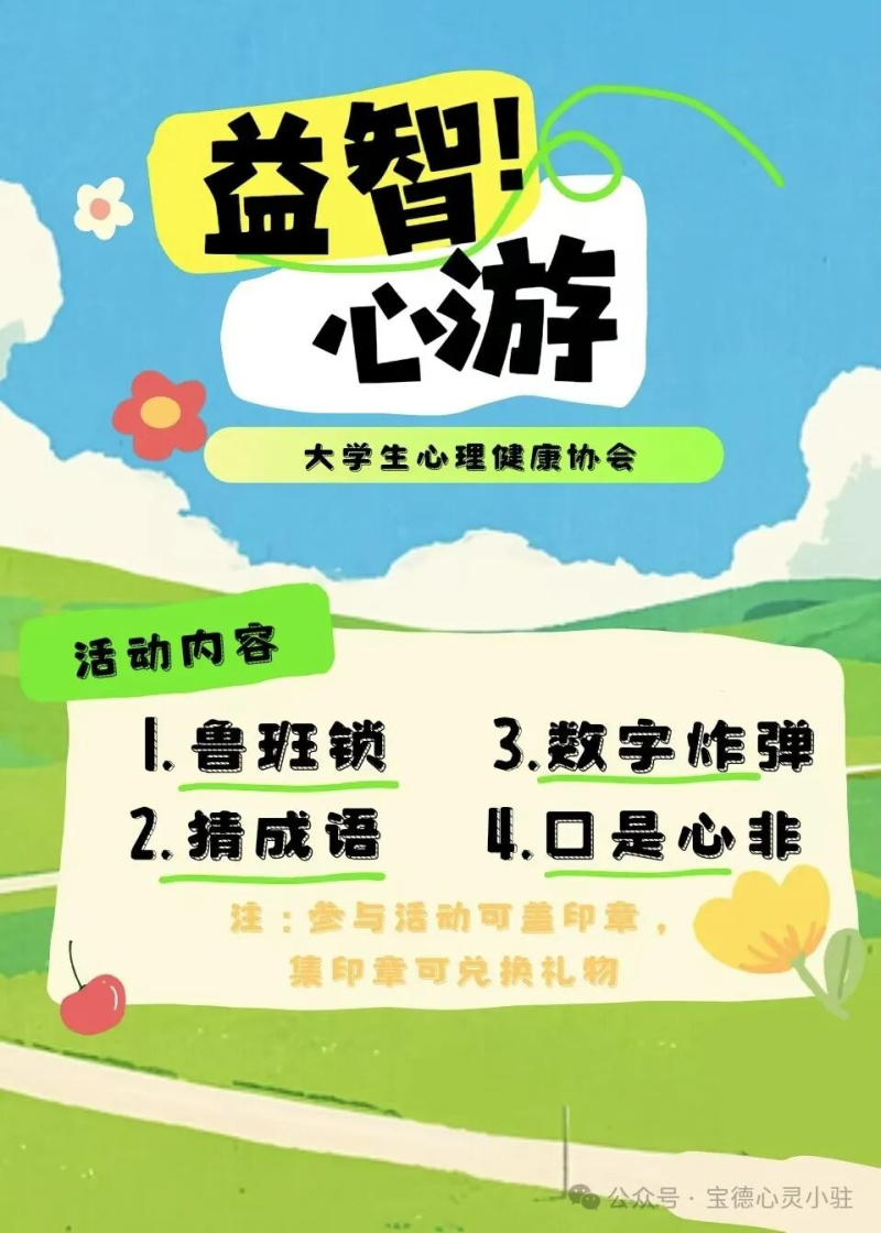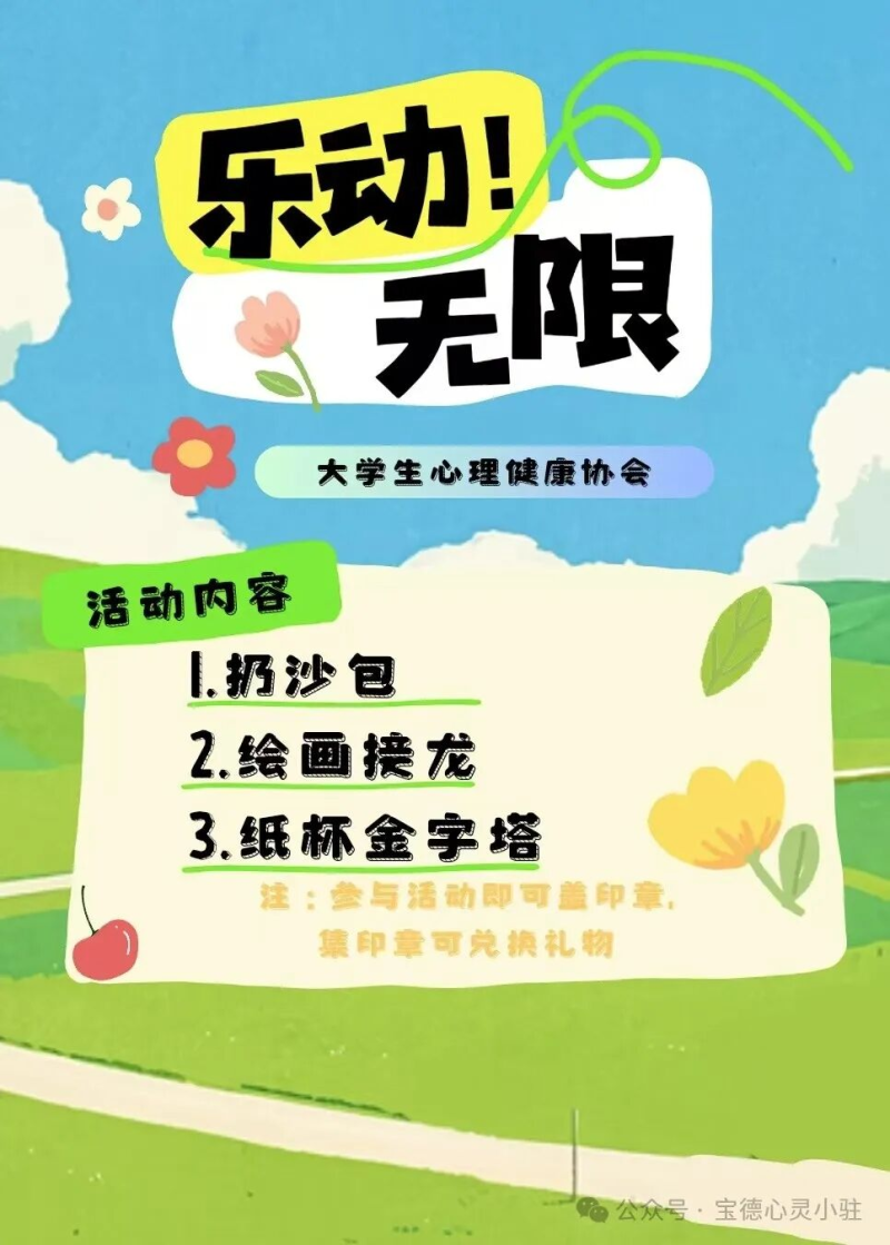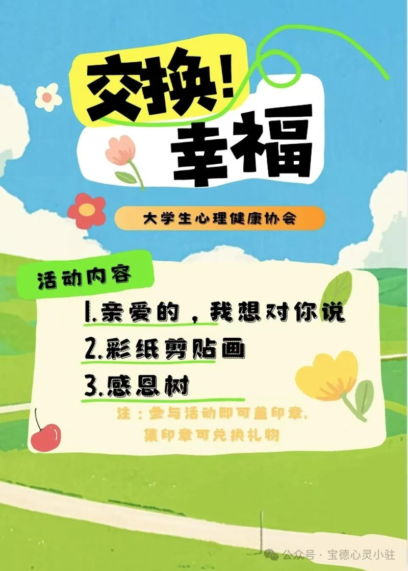 爱自己,是终身浪漫的开始。无论是忙碌的学习,还是琐碎的生活,别忘了留一份温柔给自己。在此,心理健康中心为你准备了一系列温暖有趣的活动,期待与你一起探索内心、放松身心、收获快乐!