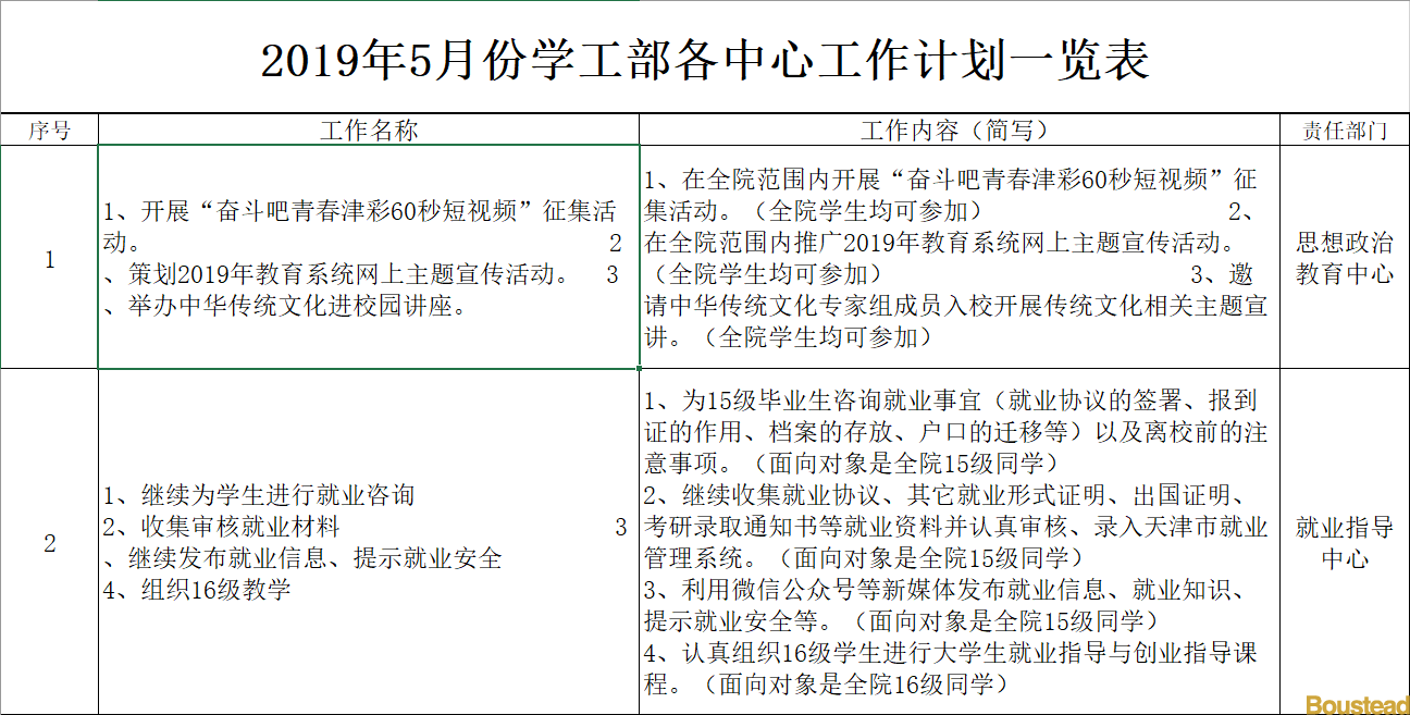 2019年5月份学工部各中心工作计划一览表