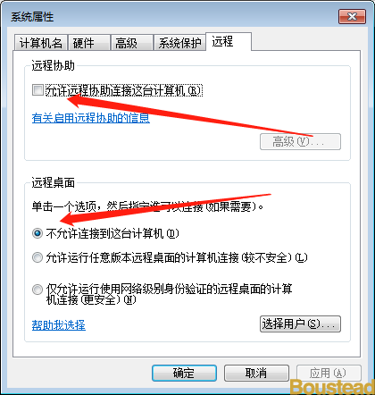 4. 在【系统属性】页面中,选择最右侧的【远程】选项卡,按下图设置【远程协助】和【远程桌面】,点击确定完成关闭。