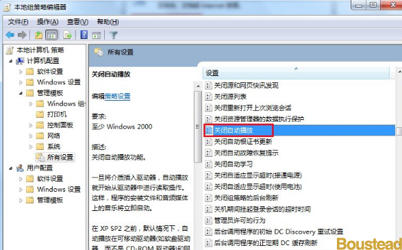 2. 在组策略编辑器中依次展开:“计算机配置→管理模板→所有设置→双击“关闭自动播放””,如下图所示: