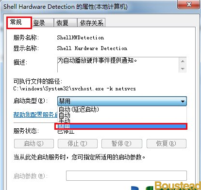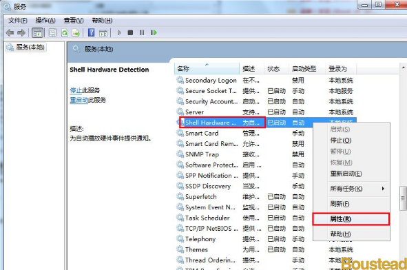 5. 然后找到Shell Hardware Detection这个服务单击右击,选择属性,如下图所示: