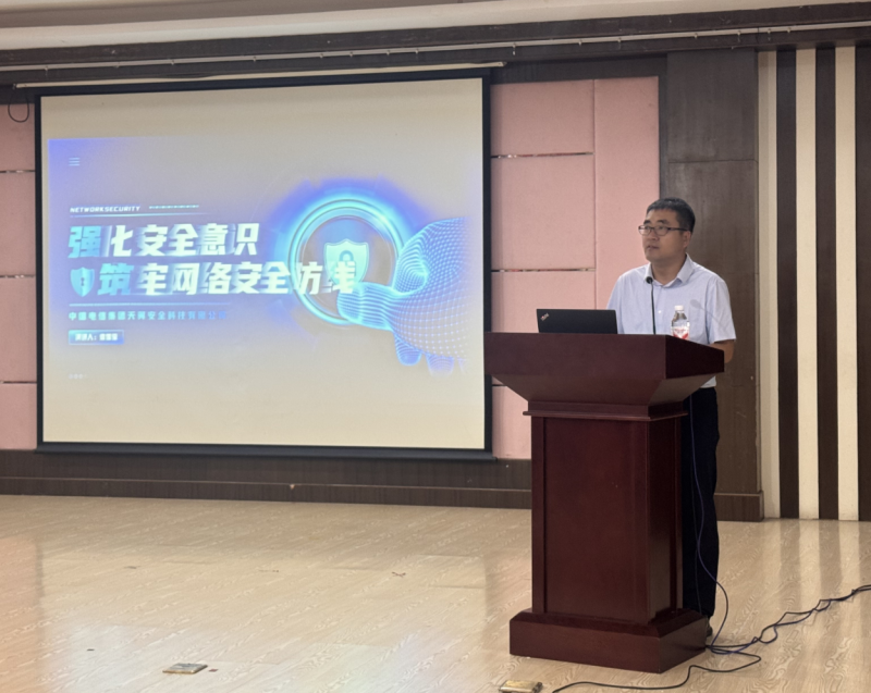 会上,中国电信天翼云网络安全工程师作题为《强化安全意识,牢筑网络安全防线》的专题讲座,从网络安全态势分析、典型案例剖析、网络安全法律法规解读等方面进行系统讲解,结合真实案例,深入分析了当前网络安全形势及主要风险点,重点介绍了防范网络诈骗、数据泄露及恶意攻击的应对策略,帮助师生全面提升网络防护意识与能力。