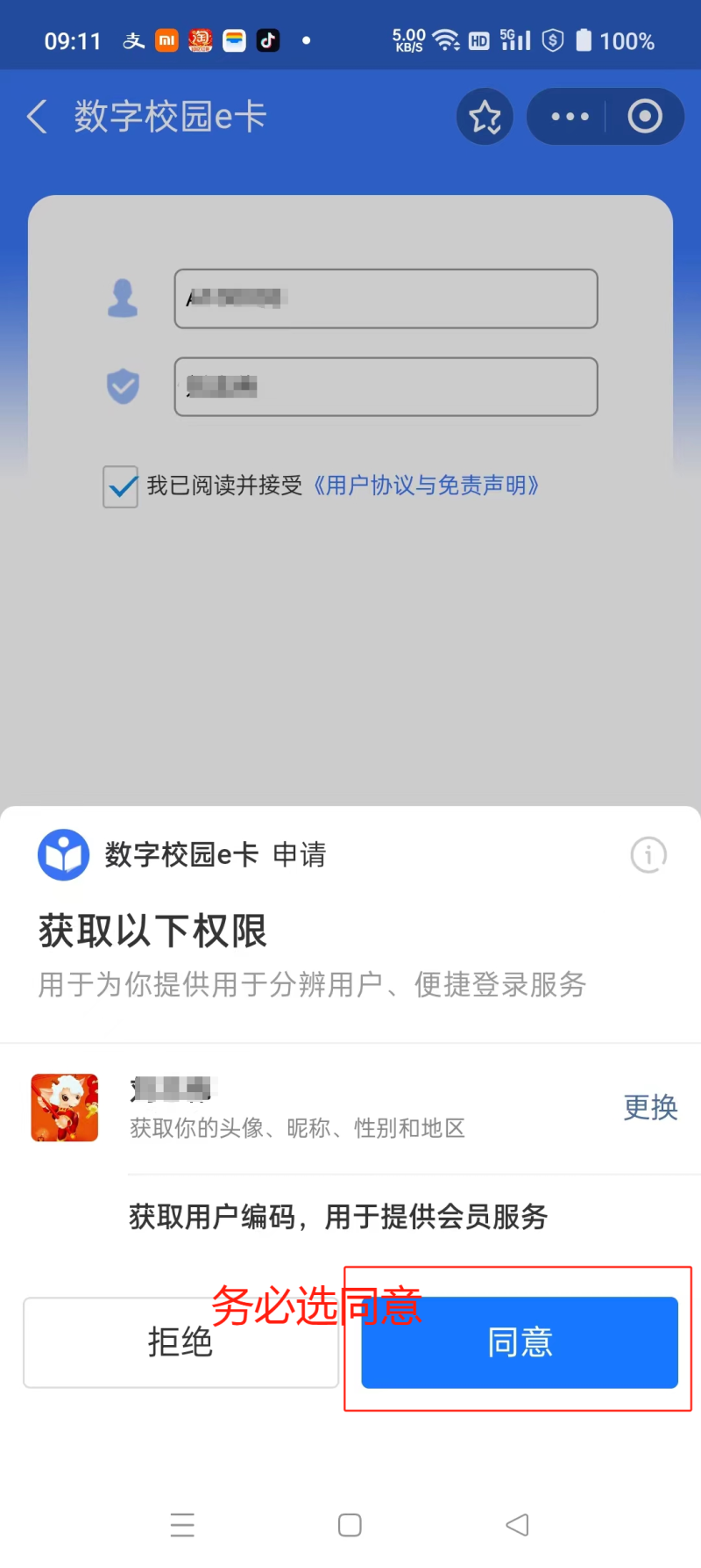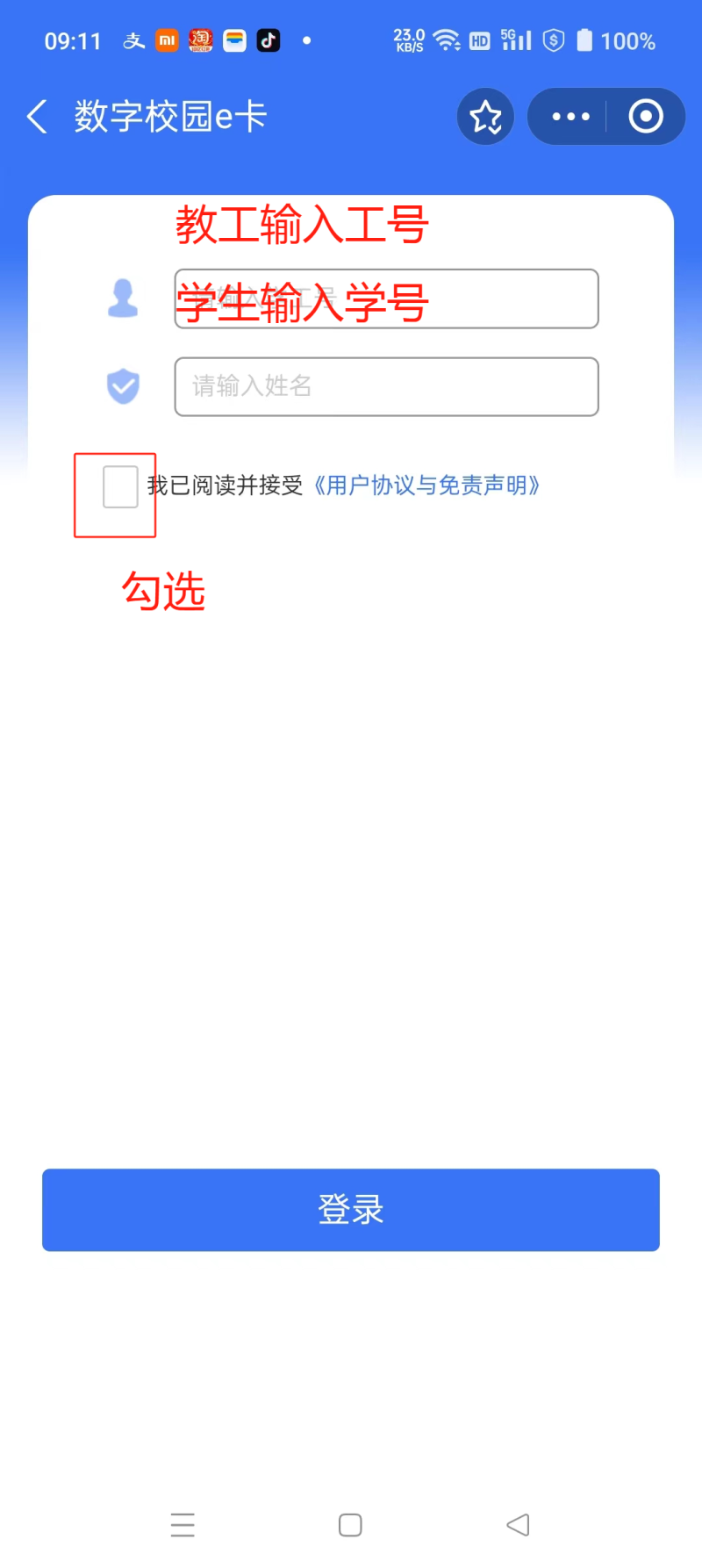 第一次领取请根据提示输入学号和姓名,并同意《用户协议与免责声明》并点击“登录”按钮。此电子校园卡绑定具有唯一性,一旦绑定不能重复绑定其他账号,需要解绑(联系相关负责老师解绑)后再绑定其他账号。
