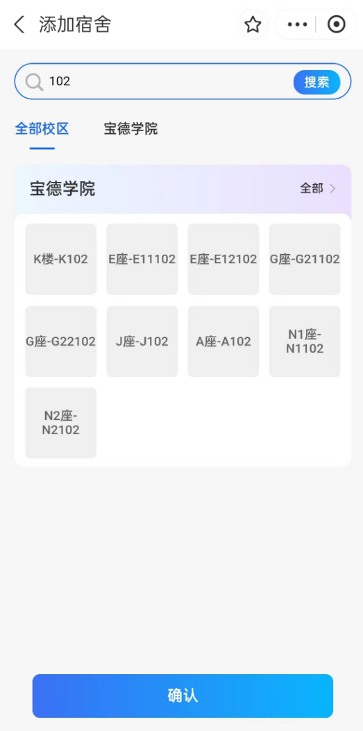 请根据同学自身住宿情况添加对应的房间号,(AXXX、EXXXXX、GXXXXX、JXXX、KXXX、IXXX、N1XXX、N2XXX,E、G是五位数字,A、J、K、I、N1、N2后面是三位数字,注意字母都为大写,E座男生宿舍一般为E11XXX,女生宿舍为E12XXX,G座男生宿舍一般为E21XXX,女生宿舍为E22XXX,但部分女生宿舍也有E11H或者G21开头出现,绑定房间时请确定好自己的房间号)。