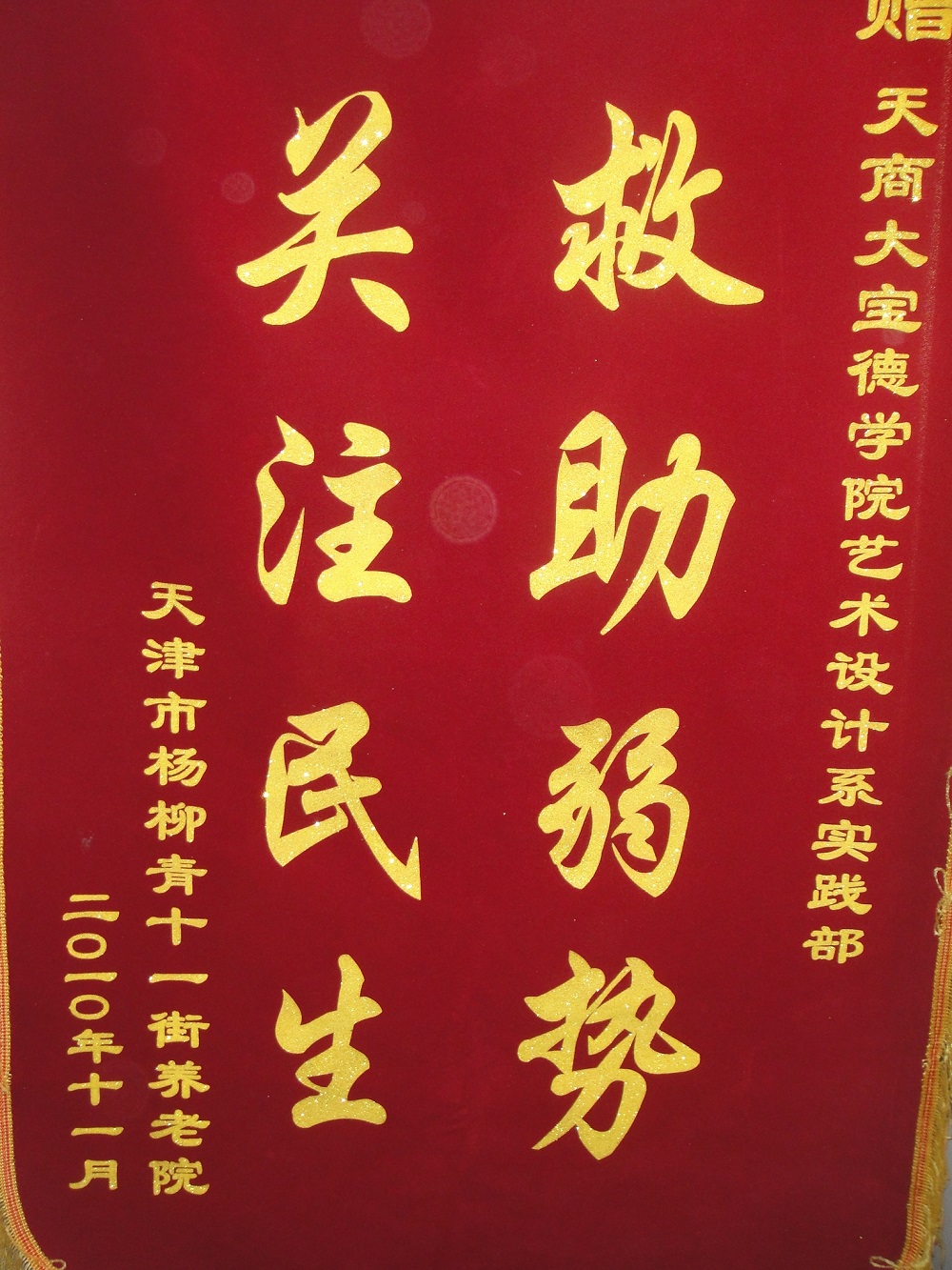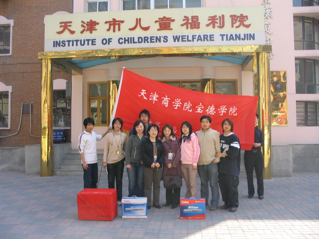 我系团总支十分重视社会公益活动,自05年以来持续开展“帮孤助残、爱心奉献”公益活动,积极组织青协和红会的同学参与。将“敬老、爱幼”作为学生干部优良传统的传帮带传递下去。曾多次为天津市儿童福利院捐款捐物,每学期定期慰问天拖南敬老院、杨柳青养老院。分别获天拖南敬老院、杨柳青养老院各赠锦旗一面。通过这些活动传承中华美德,激发同学们的社会责任感和使命感。